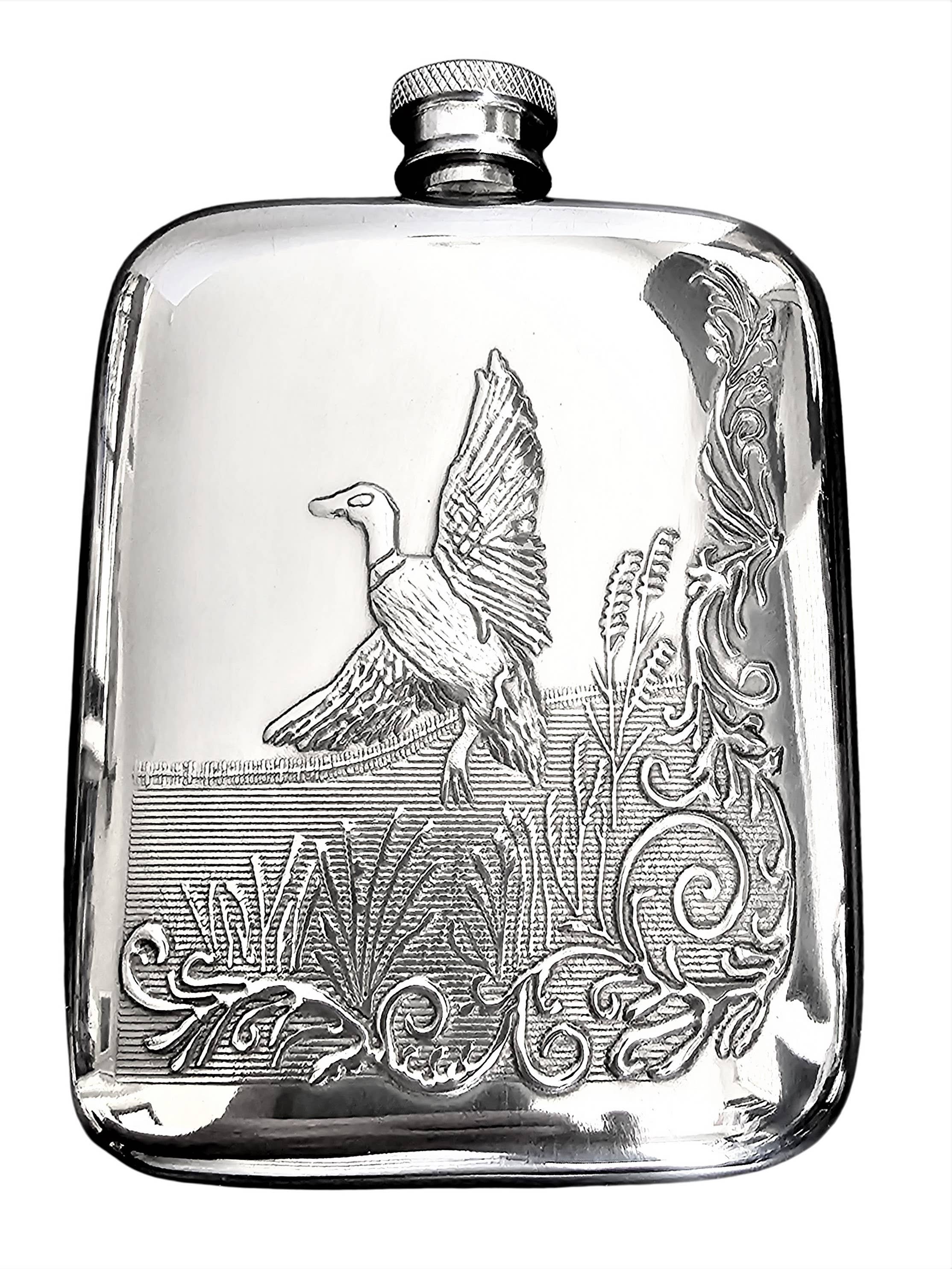 English Pewter 6oz Shooting Flask This is a Stylish Pewter flask made for Corbell. It comes in a black presentation box with a black drawstring felt bag for protection; this bag is functional after purchase for safekeeping. All of our pewter hip flasks are individually handmade by a skilled craftsman. As one of the leading sellers of Pewterware in the World, we are conscious of the quality we represent. All our pewter hip flasks make an ideal gift for any occasion. It can be filled with your choice of alcohol, e.g., whiskey, vodka, or brandy, including Gin. The possibilities are endless. We sell many different designs and patterns, so a pewter hip flask will be on our website to suit your needs.