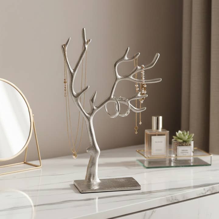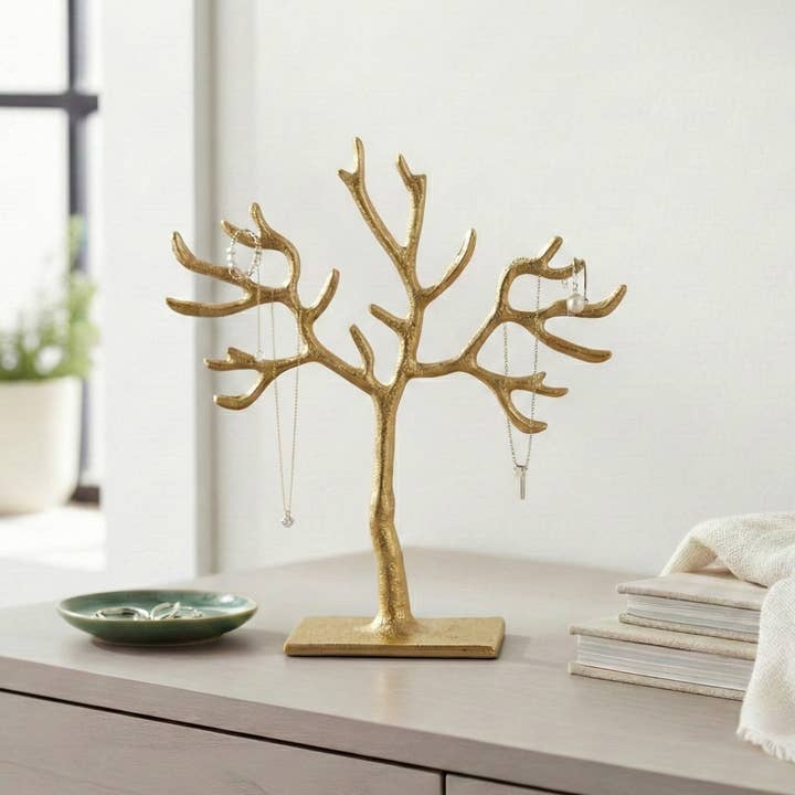 Introducing our Tree Jewelry Holder, a stunning addition to your home decor. Crafted with meticulous attention to detail, this large-sized jewelry holder is designed to keep your precious accessories organized and beautifully displayed. Made from high-quality materials, it exudes elegance and durability. With four branches, it offers ample space to hang your necklaces, bracelets, and earrings, preventing them from tangling and ensuring easy access. Its sleek design seamlessly blends with any home interior, making it a perfect fit for your bedroom, dressing room, or vanity. Elevate your home accents with our Tree Jewelry Holder and add a touch of sophistication to your space. Perfect Mother’s Day Gift.