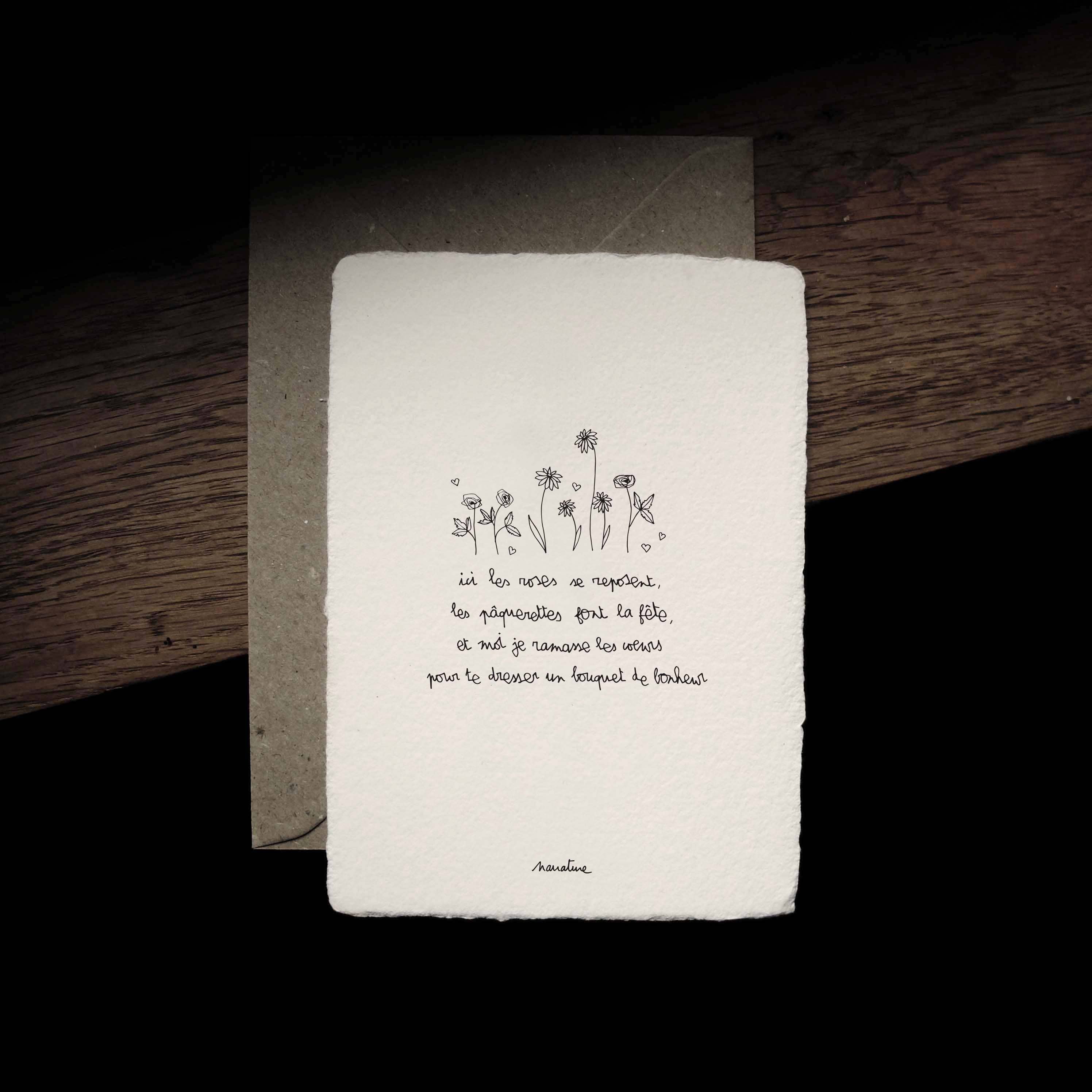 Card sold with a recycled kraft envelope in a transparent protective bag and with a brand explanation label. Handcrafted manufacturing and printing. > Handmade paper made from vegetable fibers of flax, hemp and cotton recycled by a passionate paper maker working in a mill in my region. The cards are then printed by me in my workshop in Corrèze. The paper is left raw and without lamination after printing at the mill. The poems and illustrations are thought out and drawn in my studio in Corrèze. Texts & illustrations: ©Narrature