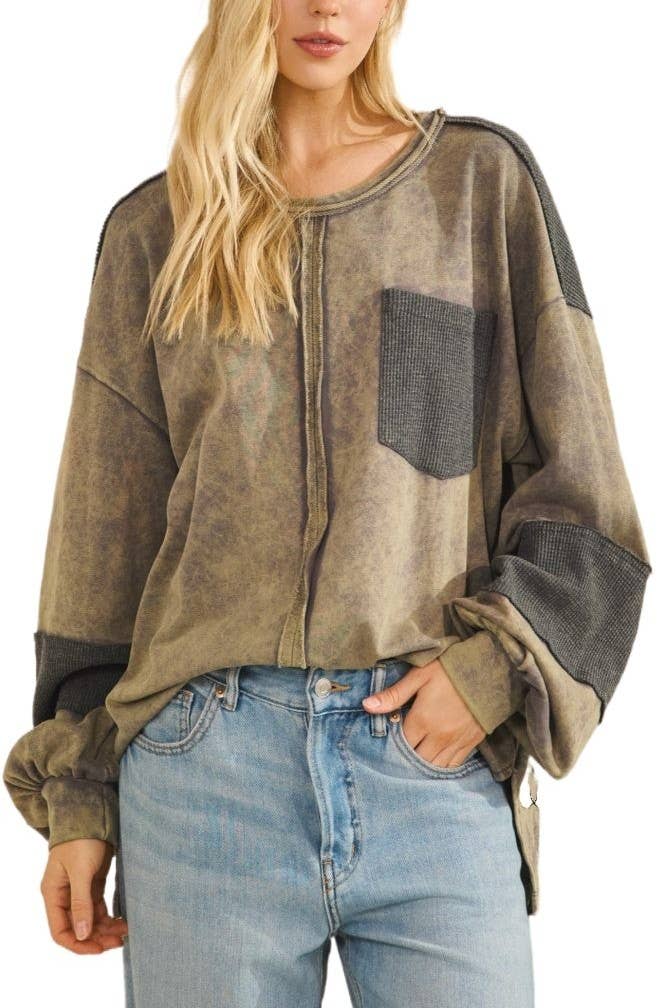 Women Solid Rib Chest Pocket Loose Fit Round Neck Top | S-XL