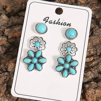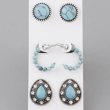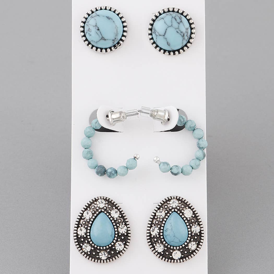 Add a western feel to your vibe with these turquoise studded earrings, perfect for daily wear. The set includes 3 pairs for easy matching with any outfit. Made of high quality, lightweight alloy material.