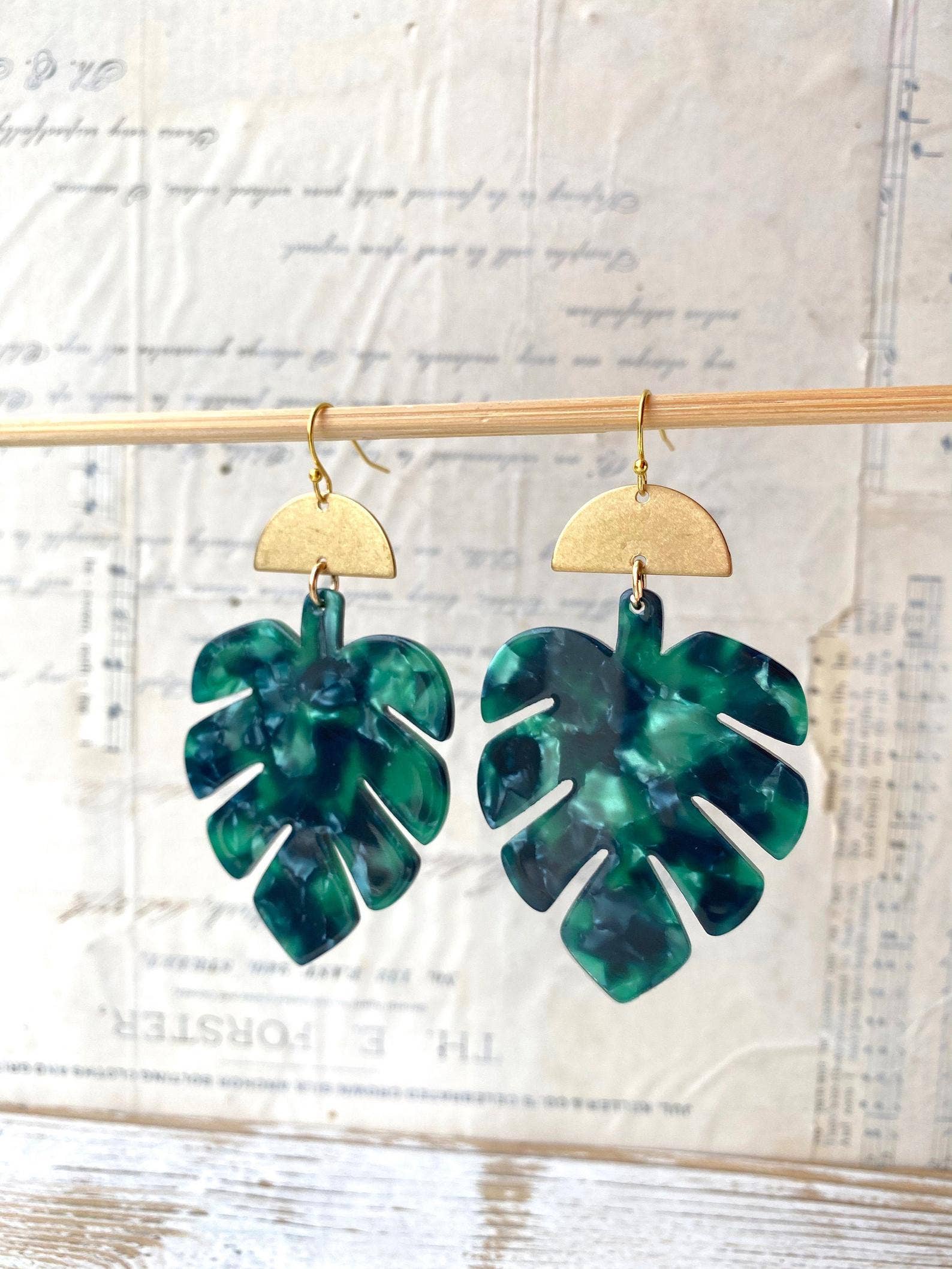 Beautiful botanical inspired large lacy style golden monstera leaf earrings. These lovely tropical earrings feature gold plate brass monstera leaves hanging from gold plated brass ear wires. Each earring measures approximately 3 1/4 inches from top of the ear wire to the bottom of the leaves.