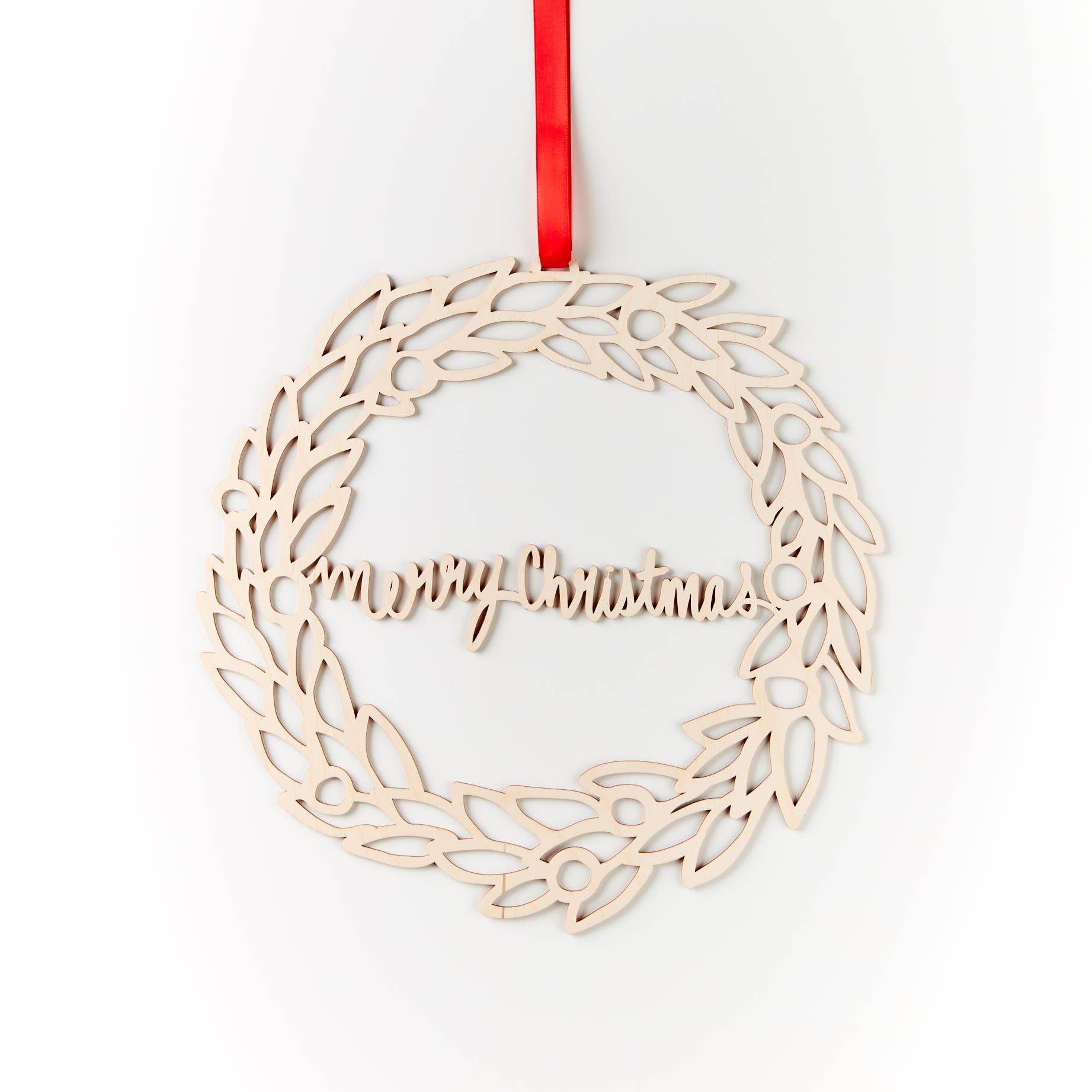 Lasercut birch wreath, measures approx 9" x 11" - reads 'merry + bright' - packaged with red string on foamcore backing. Light + Paper founder Ali creates the designs for all our products as a hand-cut original papercutting. Ali draws inspiration from the beauty of science and nature, as well as her love of cute and whimsical motifs. Once the original paper piece is completed, Ali scans the piece to digitally convert it. After some computer magic it's ready to be reproduced as a unique piece of wooden lasercut art. Each piece can be cherished as their own little original unique art piece! This piece can be hung on the tree as an ornament, or also framed to display as an art piece.