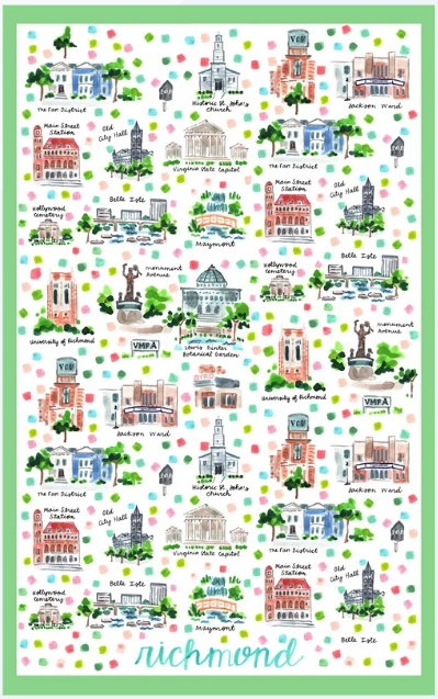 This flour sack tea towel (cotton/linen blend) features my colorful Richmond Coffee Shops design, adding a beautiful splash of color to any kitchen. This towel can be used for decorative and practical purposes! It makes a fantastic, lightweight gift for anyone with a connection to Richmond. When completely unfolded, the towel is 30"x30" and when folded six ways, 10"x14".