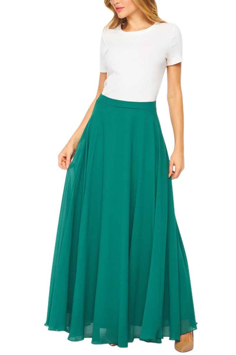 Discover the elegance of our Solid Maxi Skirt. Designed with a pull-on style and an elastic waistband for comfort, this skirt features graceful pleats and a ruffle hem for a touch of sophistication.