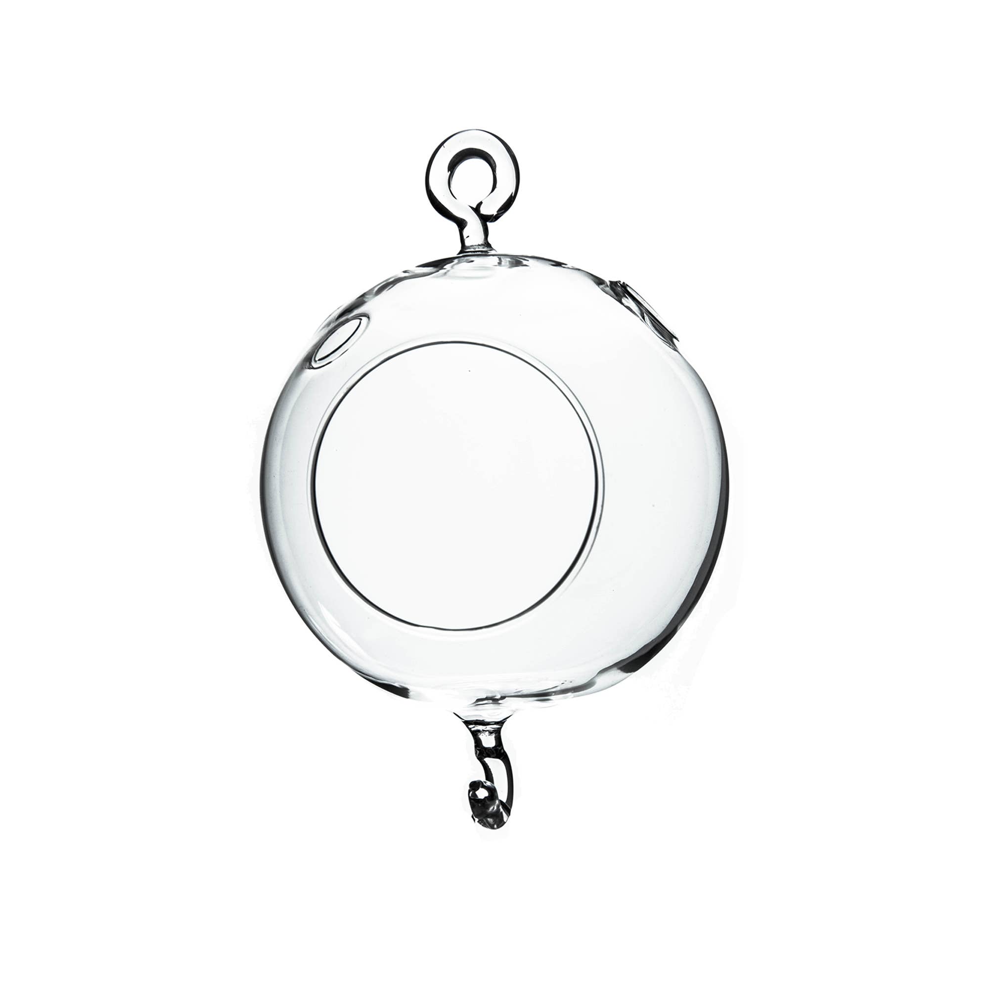 Size: width 5"(12.5 cm) height 6"(15 cm) open 2.8" varies slightly due to handmade glass Feature: 2 side holes on each plant hanger for easy watering, a flat bottom to place on surfaces Use: container of succulent, airplant, lights, candle holder, Ideal for DIY mini garden decoration