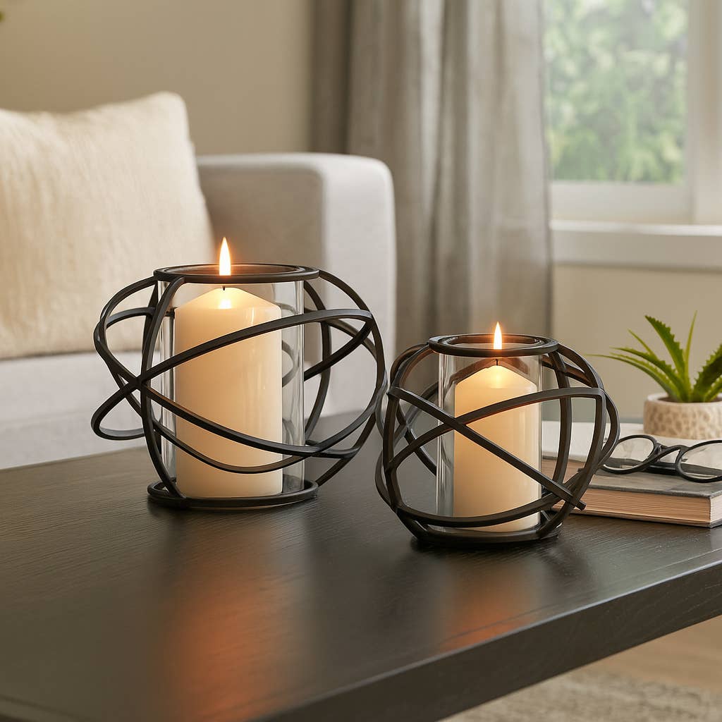 Danya B. Large Metal and Glass Orbits Hurricane Candleholder will transform your living space with its refined, rustic look and provide the right ambiance for any occasion. A great choice for bathrooms, bedrooms, porches or decks, this large glass hurricane sits on a beautiful iron orbits design holder and supports one pillar candle (candle not included). A true conversation starter, this stylish candleholder will bring sophistication and warmth to your home. Enjoy the beauty of flickering candlelight, perfect for any setting. This Large Metal and Glass Orbits Hurricane Candleholder features a sleek glass hurricane that can be conveniently and easily removed for cleaning. Well-suited for use both indoors and out, this candleholder provides a luxurious touch no matter the scenery.