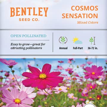Pinks, purples, and whites bring color to any garden all season long! Bentley Seed Sensation Cosmos are wonderful as a cut flower. Deadhead to have blooms all summer. Easy to grow and even easier to enjoy! Growing Instructions: In a prepared garden bed, sprinkle seeds over soil. Keep moist until seedlings emerge. Thin seedlings to 8 inches apart. Seed Information: Lifecycle: Annual Time to Maturity: 7 weeks Sun Requirement: Full sun Spacing: 8" apart Depth: 1/4 inch 80-85 Seeds Per Packet Bloom Season: Summer to fall Height: 36" - 72" Low Maintenance: Yes Seeds/Oz: 5,000 Sowing Method: Direct Sow Uses: Cottage garden Bee attractant Butterfly attractant Wildflower Additional Information: Plant Scientific Name: Cosmos bipinnatus Packet Size: 3 ¼" x 4 ½" Online resale prohibited