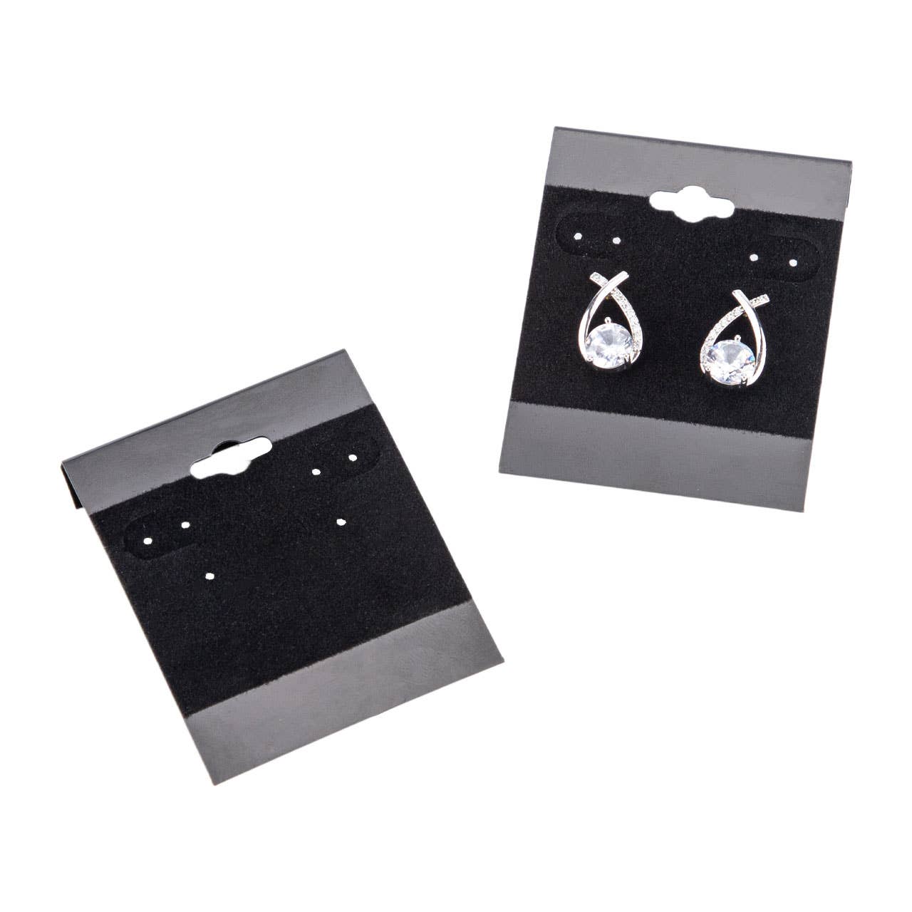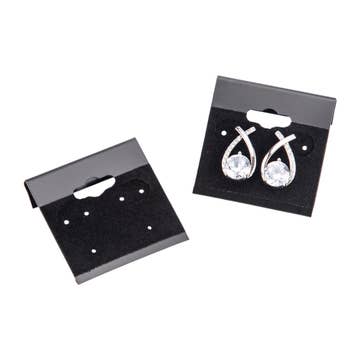 Black Velour Earring Cards are the best choice to display all types of fashion earrings. Earring cards have a lip on the back for attaching to jewelry displayers. Each card is plain without writing. It has hole placement for post, fishhook and clip style earrings. The hole placement and tabs are spaced out to allow for 1 pair of post earrings to display on one card. 100 cards per pack.