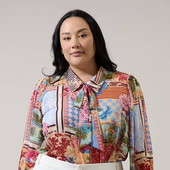Model & Fit Model: Penny (5' 7" and size 4 or S) is wearing a size Small Oversized Fit Unlined High Stretch Button-Front Closure Runs Large Fabric & Care Material: 100% Polyester Care Instructions: Hand Wash with Cold Water, Do Not Bleach, Hang or Line Dry Manufactured Overseas Bust Body Length Sleeve Length XS 42 27 28 S 44 28 29 M 46 28 30 L 49 29 30 XL 51 29 30 2XL 54 30 30 3XL 56 30 31