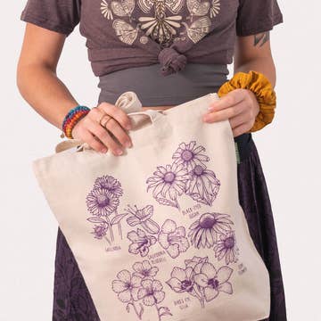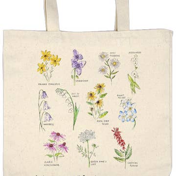 The earth is full of beauty and so is this Wild Flower Botanical Tote Bag! This canvas bag is printed with an illustration of nature's most precious charms: Gaillardia, California Blue Bell, Black-Eyed Susan, Blue Flax, Bird's Eye Gilia, and Cone Flower. Take this reusable bag with you to a picnic, art class, or farmer's market and enjoy the flower imagery along the way. 15 x 17 inches with a 5 inch gusseted bottom. Natural. Wild Flower Botanical Tote Bag - Wild Flower Tote Bag | Gardener Gifts | Soul Flower Our Soul Flower reusable tote bags are made to be used, loved, and lived in. Screen printed by hand on heavy duty organic cotton, each canvas tote features snarky, fun, and nature inspired graphics that feel a little cheeky and a lot soulful. These boho tote bags are designed to hold up to everyday adventures and make easy, meaningful gifts. Thoughtfully made in the USA or India, our tote bags reflect our commitment to quality, creativity, and conscious production. Easy to merchandise, they’re a natural fit for gift shops, nature centers, co-ops, and souvenir stores looking for unique tote bags with personality. Each tote is a small expression of Soul Flower’s free spirited roots. Hand screen printed with care, our totes carry a little extra heart in every detail. Fabric & Care 100% Organic Cotton Made in India, printed in the USA Woven canvas fabric, heavy duty Fabric weight: 12 oz/sq yd Spot clean by wiping gently with a damp cloth and line dry.