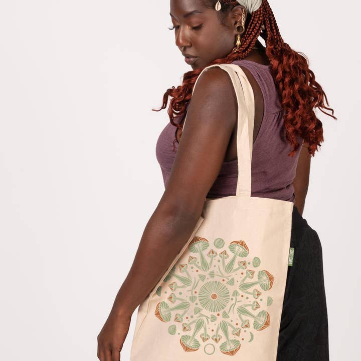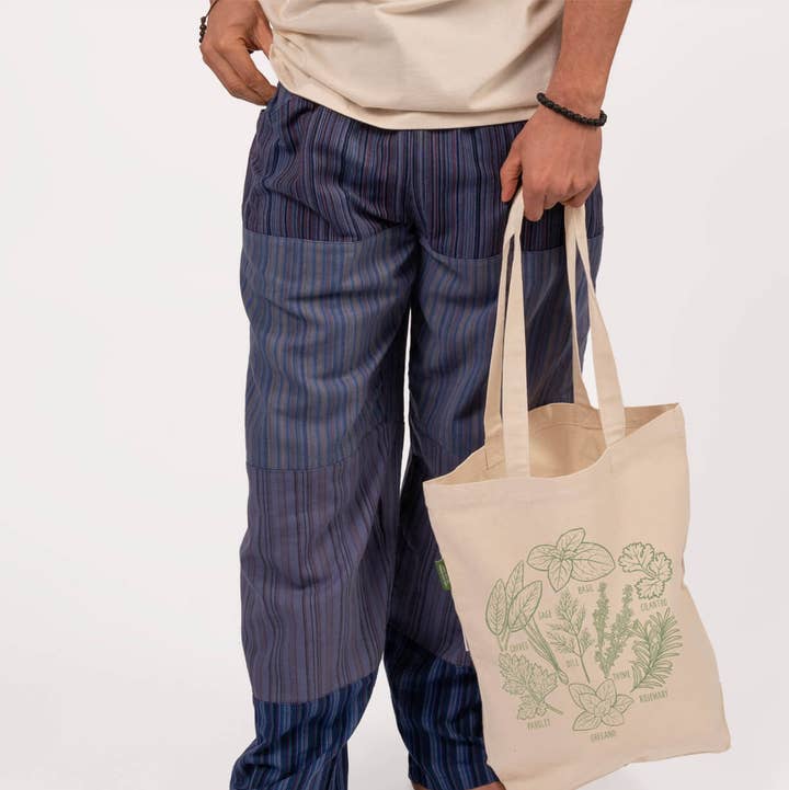 SKU: SFO716 Made in India Bag Size: Large Color: Off-White and Purple Fabric: 100% Organic Cotton Occasion Theme: Everyday Pattern: Graphic Season: Core Product Language: English Weight: 213.19 g (7.52 oz) UPC: 840150333746 Product Materials: Organic Packaging: Plastic-free and Recyclable Production: Fair trade