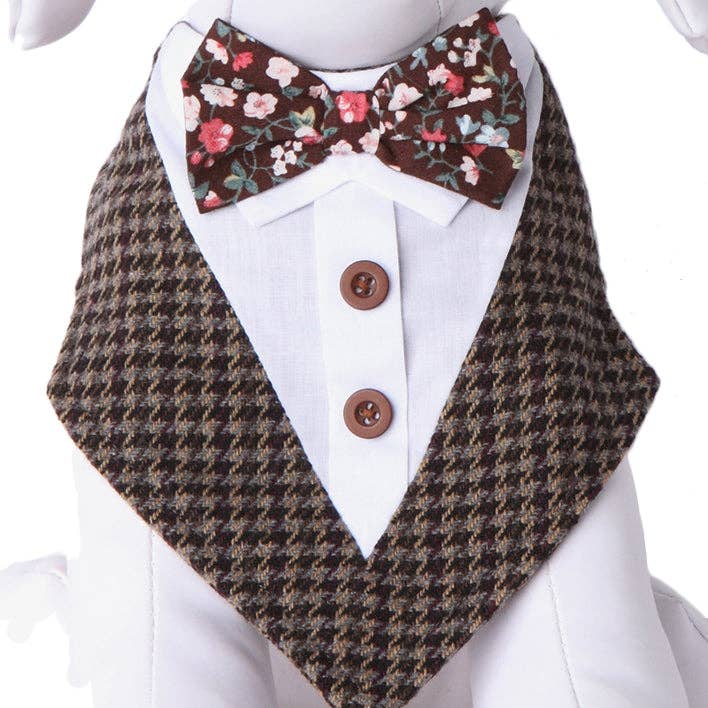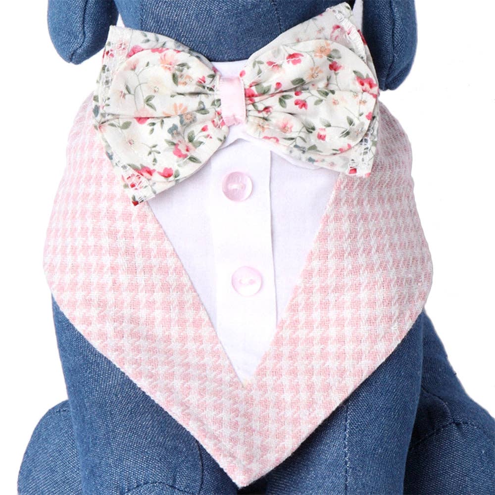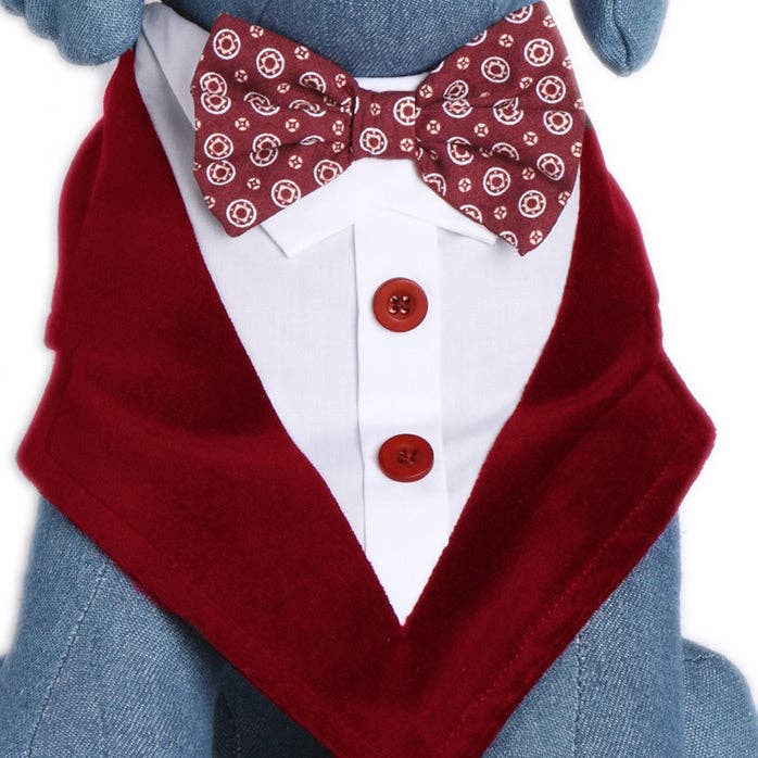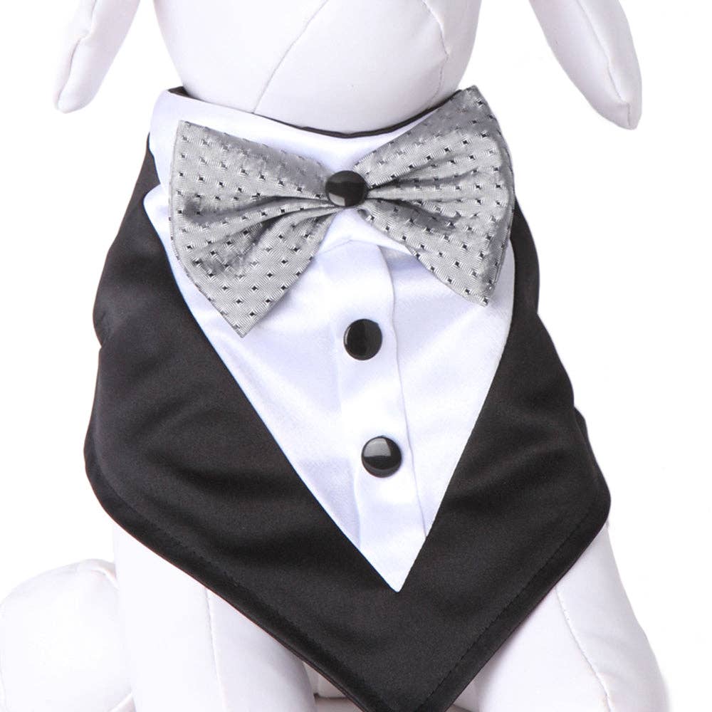 Perfect item for that special wedding event that includes your furry friend! Scoop neck formal dog bandana features collar with neck or bow tie design, along with decorative buttons. Easy to tie around neck. This product fits most small to medium sized dogs. Medium Size fits 10"-15" neck line. Large Size fits 16"-24" neck line.