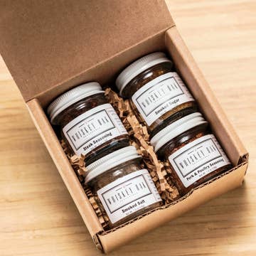 This small jar gift set includes a sampling of our four famous smoked seasonings: Whiskey Oak Smoked Salt, Whiskey Oak Smoked Sugar, Whiskey Oak Steak Seasoning and Whiskey Oak Pork & Poultry Seasoning. Just enough to try each one and all wrapped up in a rustic box for your gifting needs. Not too big, not too small. Perfect for a hostess gift, office gift, team appreciation, stocking stuffer and especially for that foodie in your life. 3.5oz (a sample of each of the four) Smoked Salt – 1 oz. Smoked Sugar – 1 oz. Steak – .5 oz. Poultry – 1 oz.