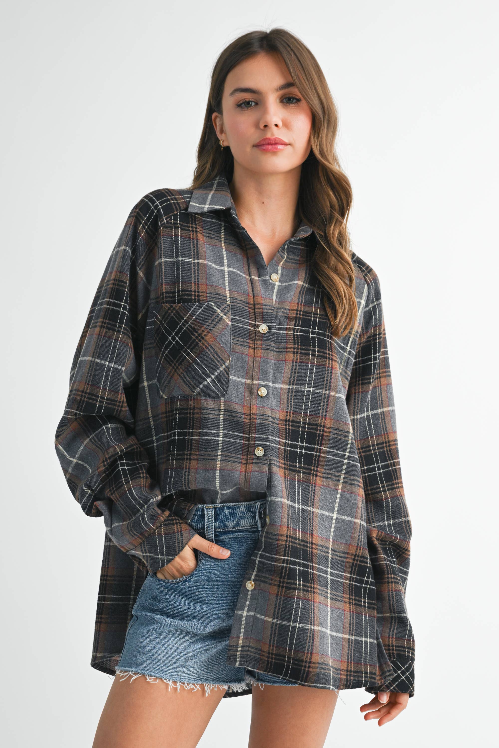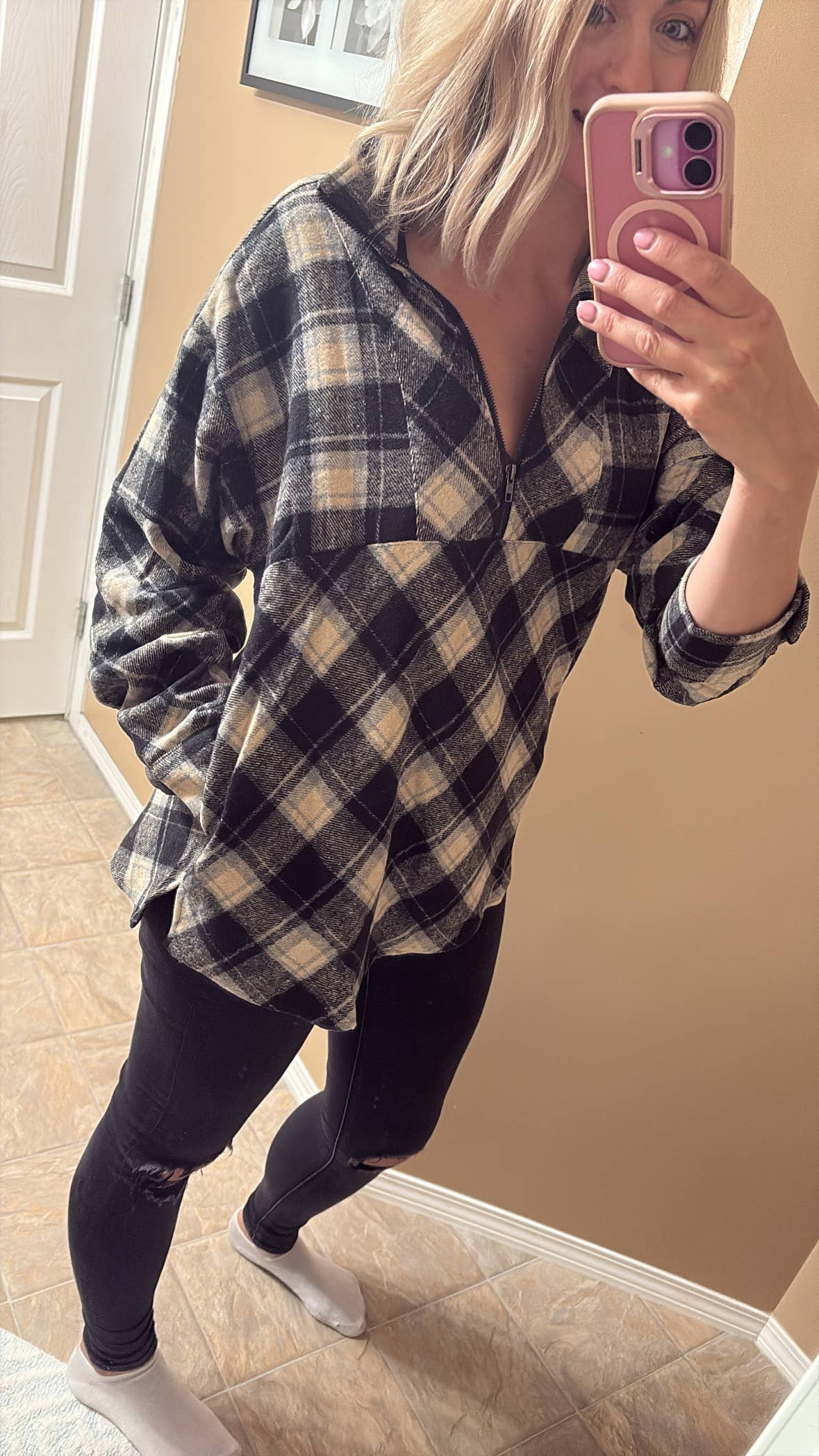 Stay cozy and chic in this oversized Mya plaid pullover, designed with a slouchy fit and versatile zip neckline. Perfect for layering up on crisp mornings or throwing on for laid-back adventures, it’s an instant cold-weather favorite.