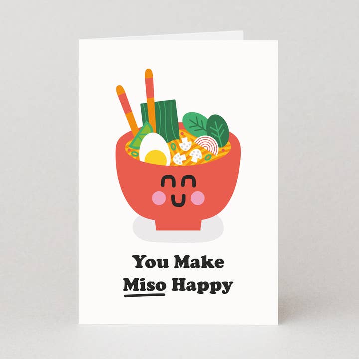 Chopsticks entwine, twirling delicious-looking noodles out of a smiling white bowl of Pho - a tasty Vietnamese soup with a name ripe for punning. The caption on this birthday card reads "Happy Birthday Mo' Pho" in a play on words that will bring a smile - and that's pho sho. The inside of the funny birthday card is blank, ready pho you to add a handwritten message as the finishing touch. Greeting Card Features: Size: A6 = 105 x 148mm (4” x 6”) Blank inside for a personal message Material: Sustainably sourced 300gsm papers Supplied with recycled brown kraft envelope Packaging: Plastic-free Made in the UK Case of six greetings cards Greeting cards with colourful illustrations and funny captions are the specialty of UK based stationery brand Studio Boketto, which has a wide range of designs for all occasions. Known for their distinctive style and gut-busting humour, the brand’s eco friendly paper products create an eye-catching instore display. Plus, they’re packaged plastic-free!