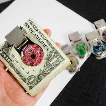 This money clip is decorated with recycled circuit board (25mm, 1 inches) set under resin. The resin provides a beautiful yet protective finish. The clip is one inch wide and features a hinged structure to securely hold money and cards. Assortment: rather then tediously adding each individual color option to your cart, select "assortment" and I will choose a mix of colors. Choose your packaging: carded or boxed.