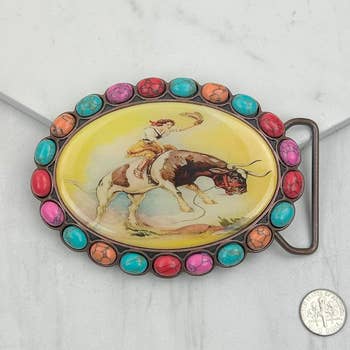 Buckle up and add a touch of cuteness to your outfit with our adorable Buckle Up Belt Buckle! Featuring fun and eye-catching turquoise stones, this belt buckle is sure to make a statement. Don't miss out on this stylish and unique accessory! LEATHER BELT NOT INCLUDED Length: 3"