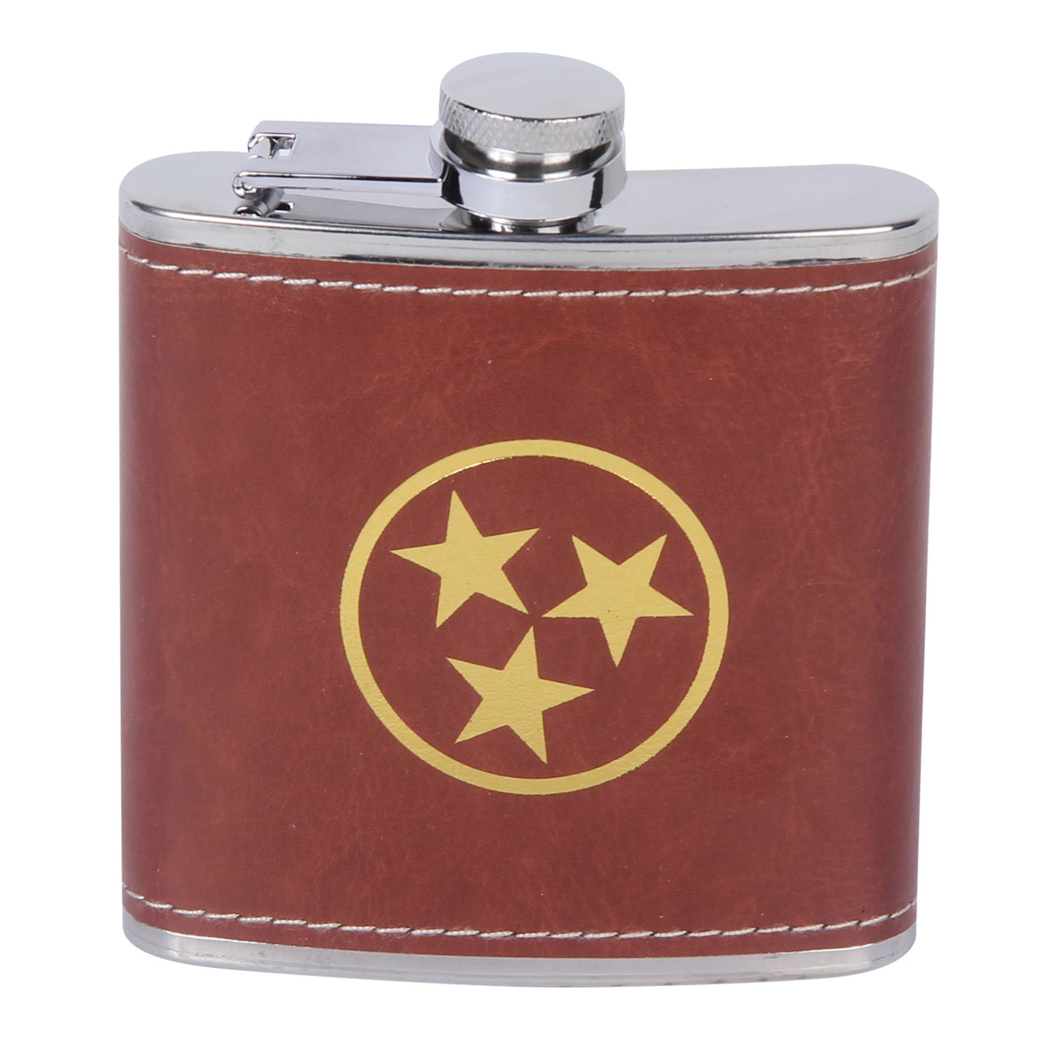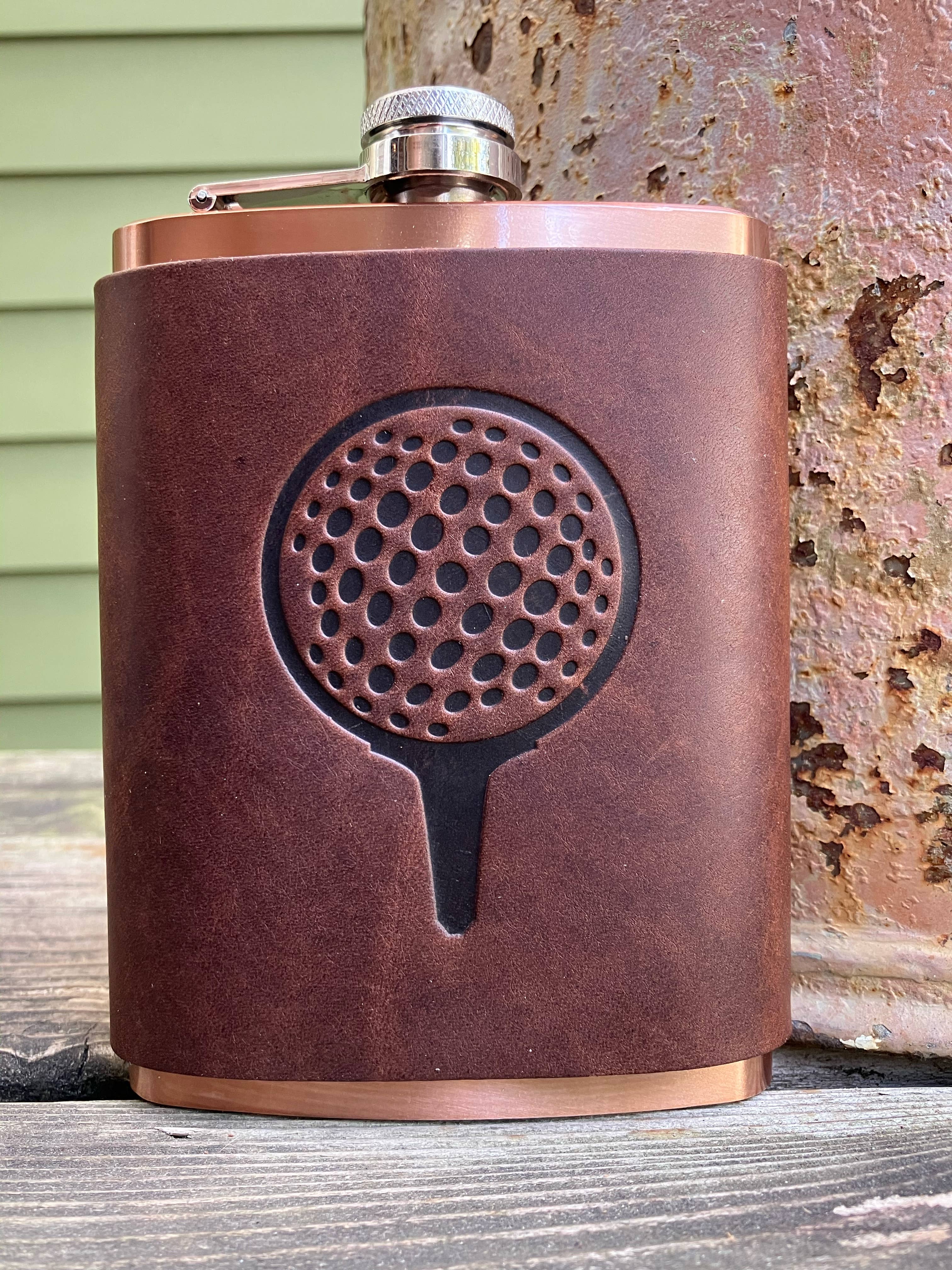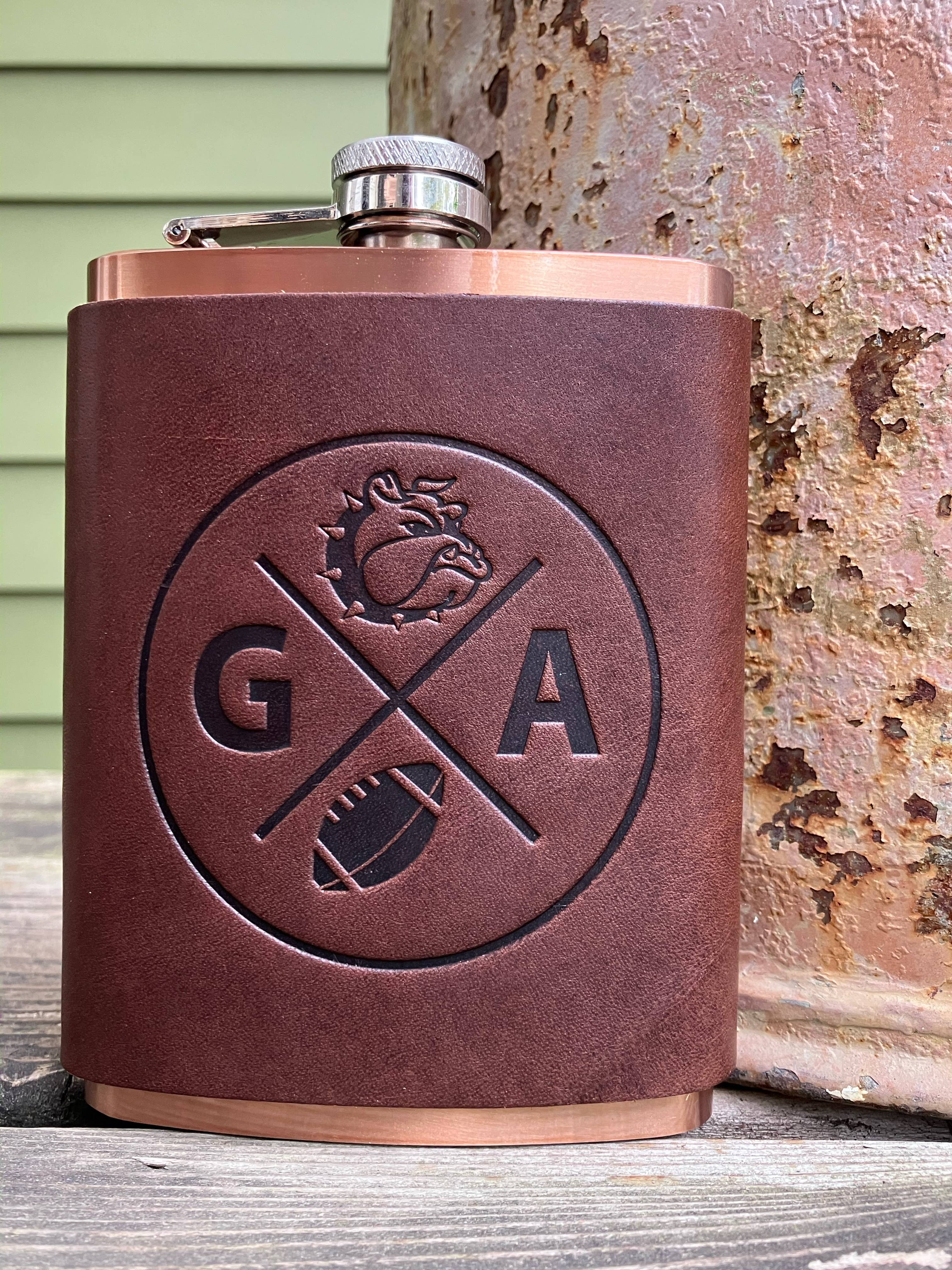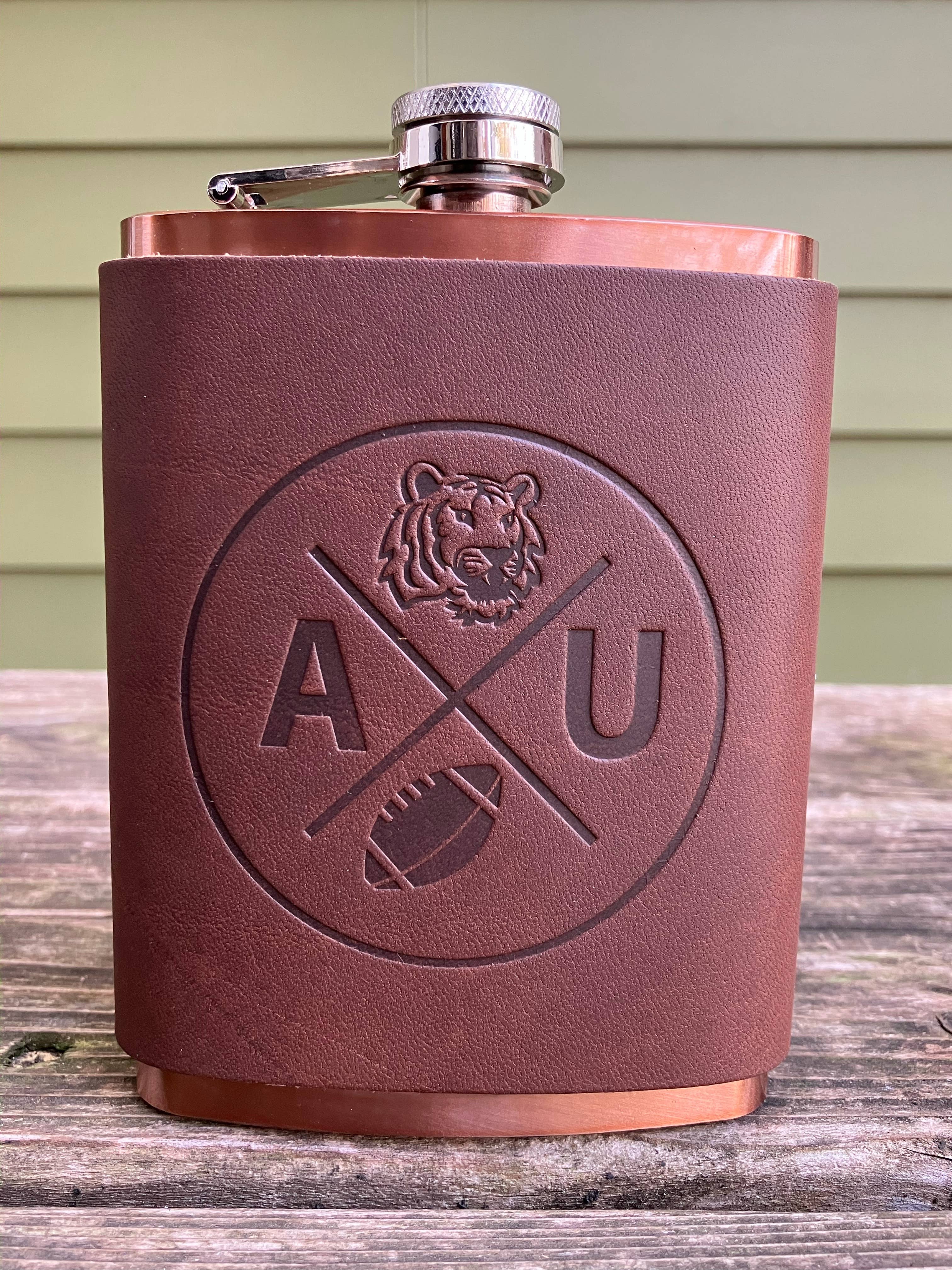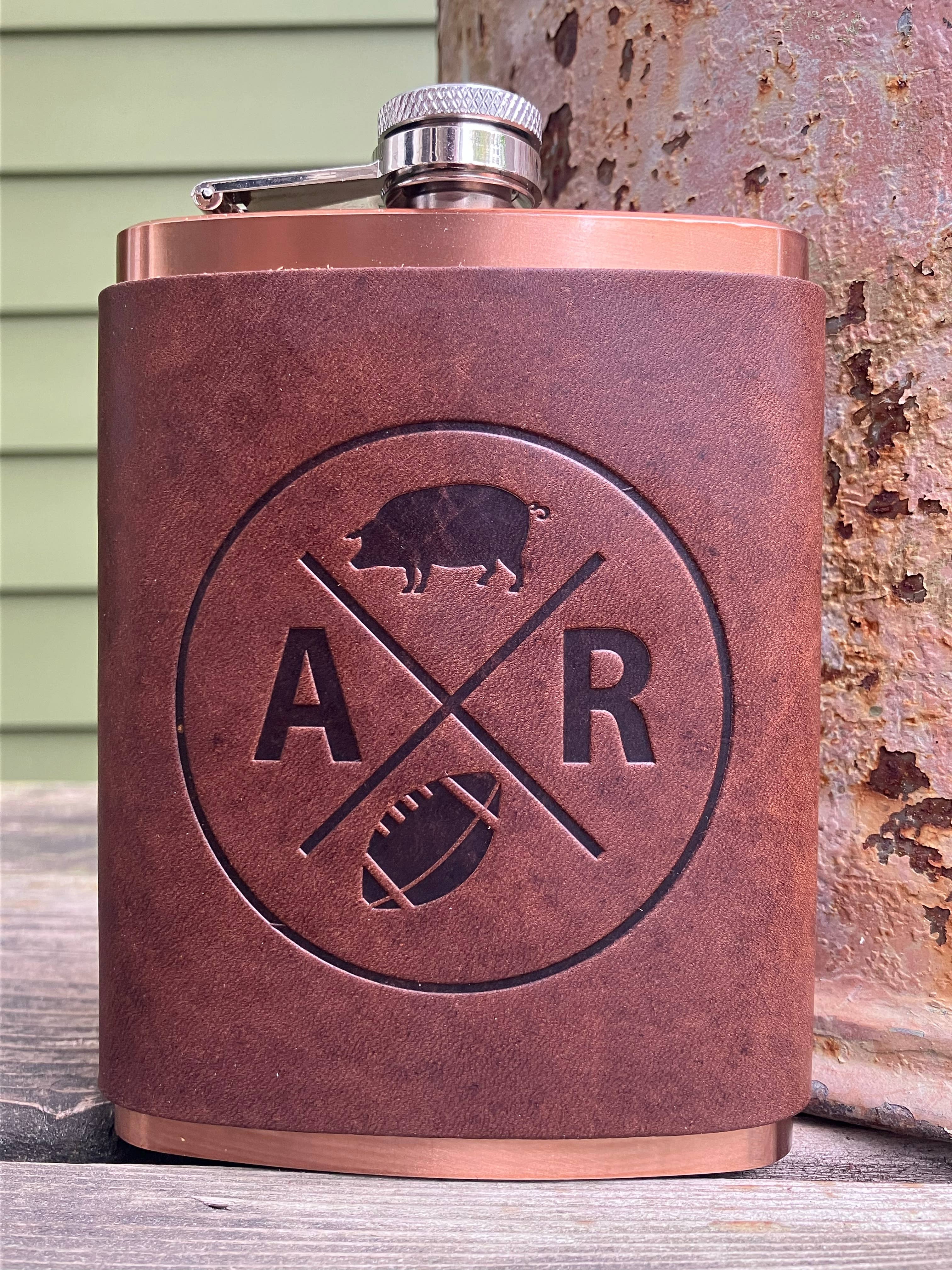 Leather Flask - Missouri Our Leather Wrapped flasks are fun, functional, gift-able, and good looking. We wrap an 8 ounce stainless steel flask (your choice copper coated or matte silver) with a leather sleeve that's hand stitched on the back. The flask has a hinged top attached. The leather is earthy, a perfect match stamped with one of our stock designs or create a custom design.
