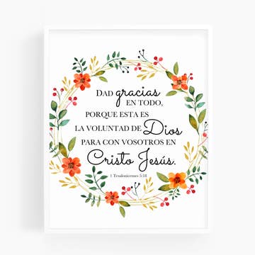 Text Reads: "Dad gracias en todo, porque esta es la voluntad de Dios para con vosotros en Cristo Jesús. 1 Tesalonicenses 5:18" This art print features beautiful hand painted watercolor flowers with modern & elegant fonts featuring 1 Thessalonians 5:18 in Spanish in the RV-1960 translation of the Bible. • Professionally printed on 110 lb. matte white cardstock • Available in 8x10 inches • Prints are packaged with a chip board and protected inside a clear plastic sleeve. **Frames in images are for example only and is not included with your order. Tags: Christian wall art, Christian gifts, home decor, paper print, cardstock, New Testament, Bible verse scripture, watercolor, floral wreath, Spanish, Español, Biblia, Bíblico, verso, texto, Nuevo Testamento