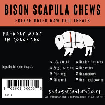 Ingredients: Bison Lung Locally Sourced Single Ingredient Minimally Processed No Artificial Colors or Flavors Crude Protein (Min) - 68% Crude Fat (Min) - 5% Crude Fiber (Max) - 4% Moisture (Max) - 14%