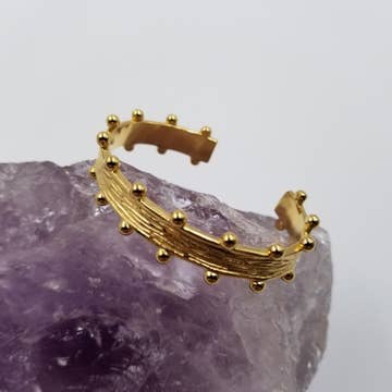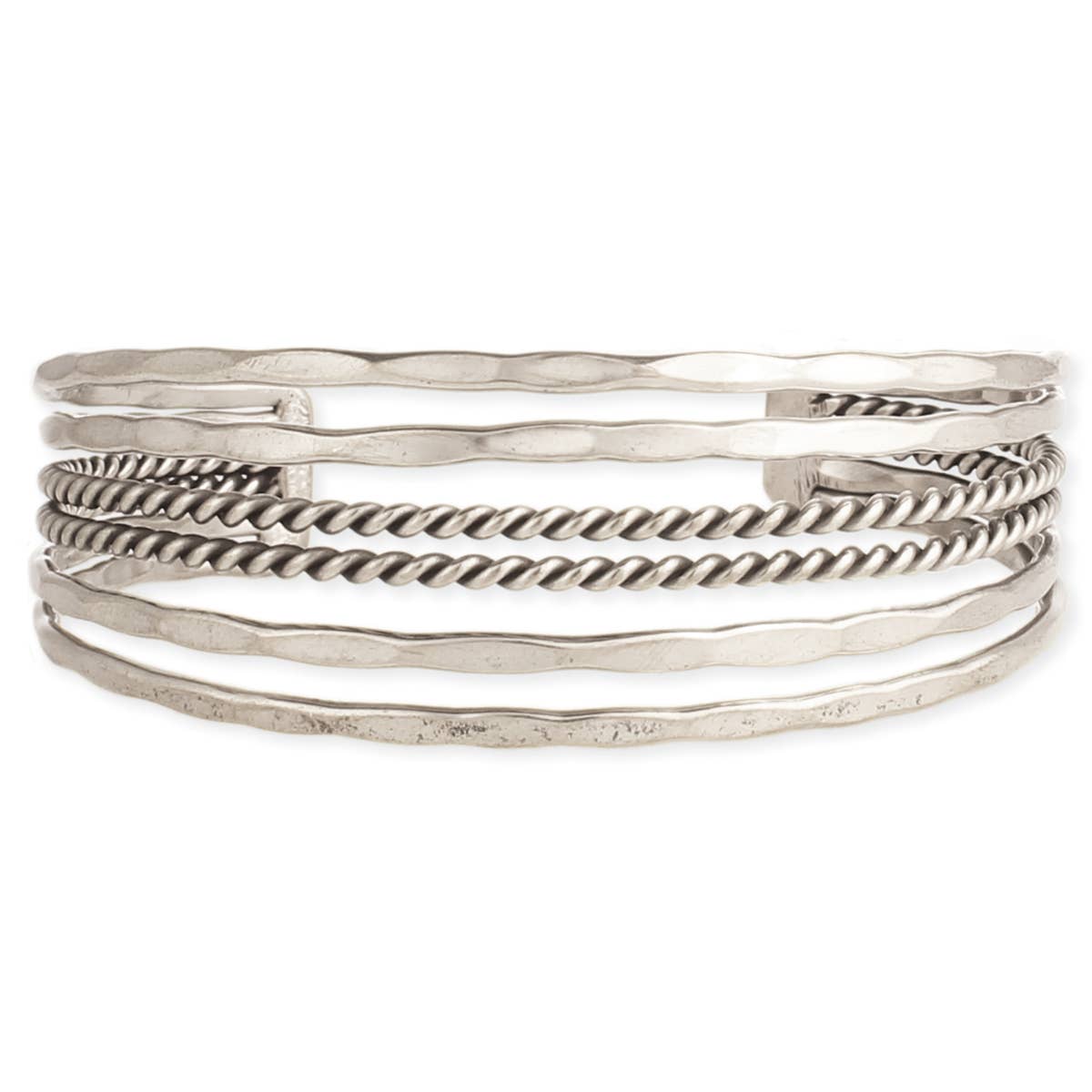 Elevate your style with the mixed metalcuff! This 4-line hammered bracelet combines silver, gold, and copper for a stunning mixed metal look. Featuring an ethnic inspired dot design, it adds texture and intrigue to any outfit. Perfect for trendsetters who love to mix things up. * Handmade in India * Mixed metal cuff bracelet * Rustic hammered cuff boho bracelet * Measures: 3/4" wide * Materials: Gold, Silver, Brass Tone Metal *