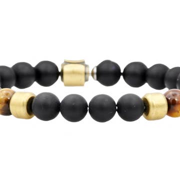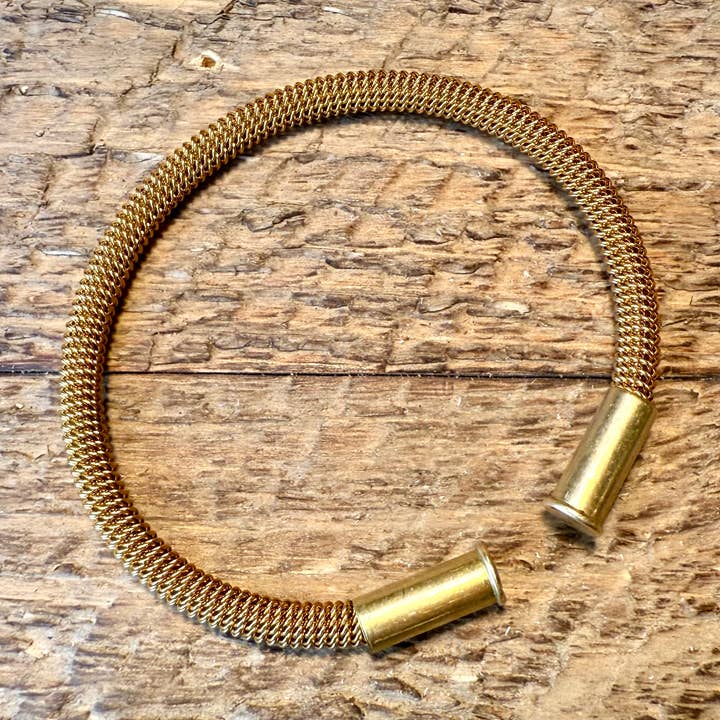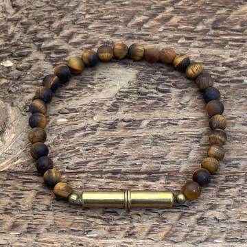 The Flint Beaded Bracelet is made using repurposed, upcycled .22 shells and strong magnets. The beads are Semi-precious Stones and Krobo recycled glass beads that are strung on stretch cord. Wear by itself or with another Flint bracelet for an authentic and rustic look that goes with any style. Wearing two of any of the Flint Bracelets together with the magnetic clasps in alignment creates a well-organized, polished style.