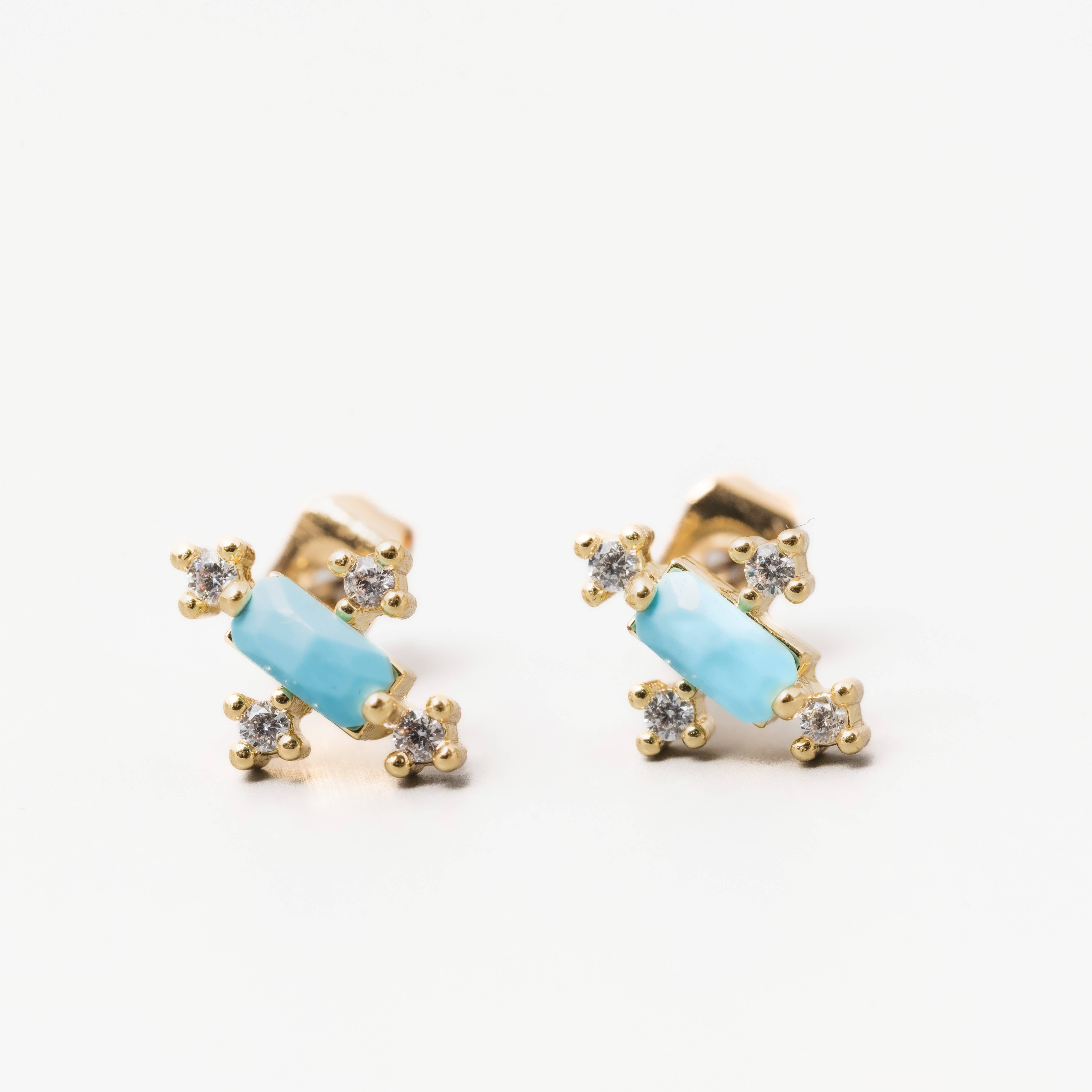 The Fiona stud earrings feature a gorgeous rose cut square stone accented with a sparkling arc of CZs. Moonstone Cubic zirconia accents 14K Gold plating with a brass base