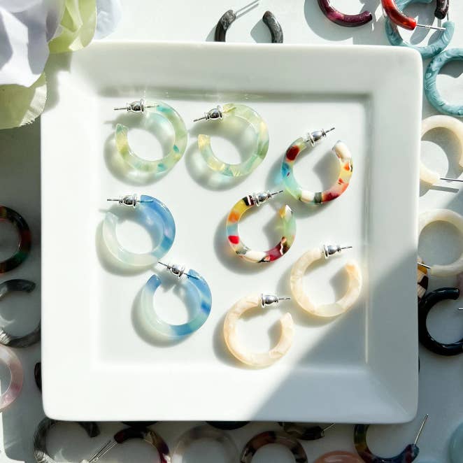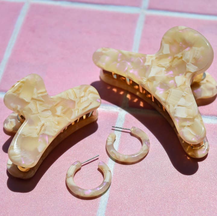Stainless steel teeth Cellulose acetate 2.5 inch All of our pieces are made from cellulose acetate. A mixture of cotton pulp and acetic acid. It is a biodegradable and eco-friendly material. Acetate is lightweight yet durable. Our acetate is sourced from Italy and Japan and then manufactured and finished in both China and Idaho. We are a small, Woman-Owned business located in Boise.
