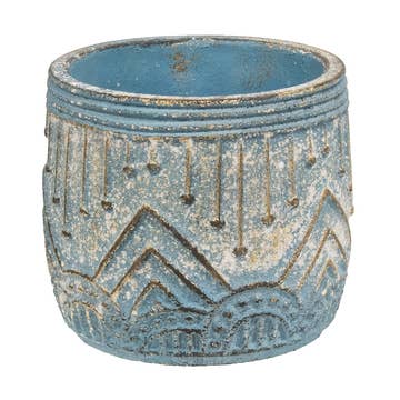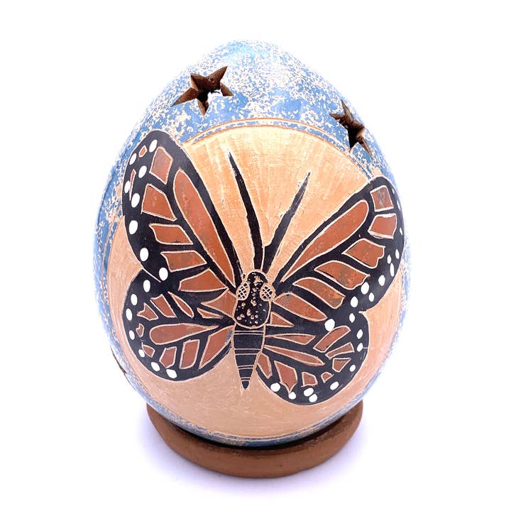 This beautiful botanical-themed ceramic luminary is handcrafted in a family workshop in the community of San Juan de Oriente, Nicaragua. Each luminary is created out of local clay, turned on a kick wheel, hand-painted, and wood-fired in a beehive-shaped kiln. For use with tea light candle or string of electric lights (not included). Approximate size: 4" wide x 5" high. Fair trade.