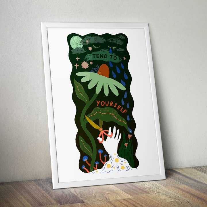 An inspiring contemporary illustrated print encouraging us to embrace growth and change as a part of the joy of living. This 'Bloom and Grow Forever' print reminds us that growing and evolving is a part of living life to the fullest. It features vibrant spring flowers alongside mushrooms, worms and a butterfly, symbolising the transformational cycle. - Unframed Art Print - Digitally printed 300gsm card stock - Packaged in plant-based compostable cellophane - Available in sizes: A5 (14.8 x 21cm) A4 (21 x 29.7cm) A3 (29.7 x 42cm)