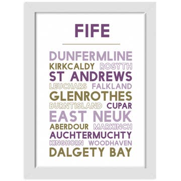 Our Fife print features the names of a selection of towns, cities and areas across the county. - Featuring our Scotland-centric sister branding – Heather and Haggis - Available in two sizes – A4 and A3 - Three finish options – unframed, white wood effect frame or black wood effect frame - Unframed prints are packaged flat on a backing board in a protective cello sleeve - A4 frames can hang or stand, A3 frames can hang only - All frames come with glass - Designed and printed in our Edinburgh studio. Frames are made in the UK Dimensions (approx): - A4 unframed 297mm x 210mm x 3mm - A4 framed 322mm x 235mm x 15mm - A3 unframed 420mm x 297mm x 3mm - A3 framed 445mm x 322mm x 15mm Please note that whilst every effort has been made to photograph items accurately, there may be slight colour variations due to different monitor settings.
