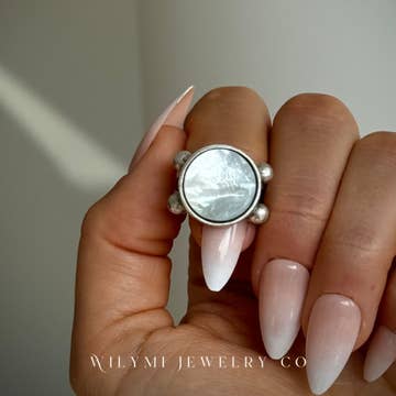 HOUSE OF WILYMI Mother of Pearl Ring 15mm Round Cut | Silver Plated | Adjustable Silver | the symbolic metal of the moon. Pairing these luminous structures with PEARL | the sea-gem of wisdom. I’ve been so deeply drawn to this pearl/silver partnership as of late | a potent reminder to the wearer of our innate connection to the grand. 15mm Round Cut | Silver Plated Adjustable PERFECT FOR: - Christmas gifts - Holiday jewelry - Holiday gifts for her - Elegant stocking stuffer - Gifts for host - Upscale gifts - Gender neutral gifts - Luxury gifts - Stocking stuffers - Anniversary gifts - Birthday gifts - Valentine's Day gifts - New Year gifts - Winter jewelry