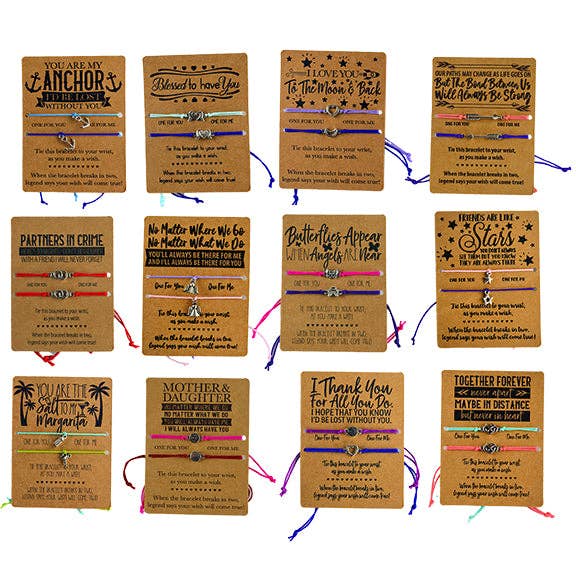 Colored bead bracelets with metal charms made with plastic from recycled bottles and other recycled plastic. Comes in assorted colors. CARDED OR INDIVIDUALLY BOXED FOR PEG DISPLAYS. COLOR/STYLE ASSORTMENT VARIES. NO RETAIL READY DISPLAY- This product has been liquidated from our wholesale department and will be shipped loose in packs of the specified # in the item name. This product is not used, but packaging may show SLIGHT signs of wear from being displayed in stores. DISCOUNTED PRICE ONLY APPLICABLE TO THIS CLOSEOUT ITEM!