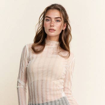 Mesh long sleeve with contrast rib mock neck. Model is 5'8" and wearing a Small. Tumble dry low or lay flat to dry.