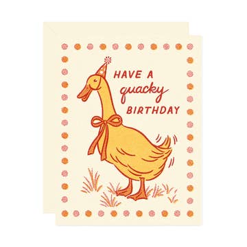 Front: Happy Ducking Birthday! Inside: Blank. Perfect for: Birthday. Details: A2 (4.25" x 5.5") card. Printed on thick uncoated, recycled card stock. Paired with a 100% recycled A2 peel and press grocery bag kraft envelope. Packaged in a cellophane sleeve. Tiny Gang Designs logo on the back. All cards are housed in a clear cello sleeve to keep them safe until you're ready to sign, seal and deliver, doll!