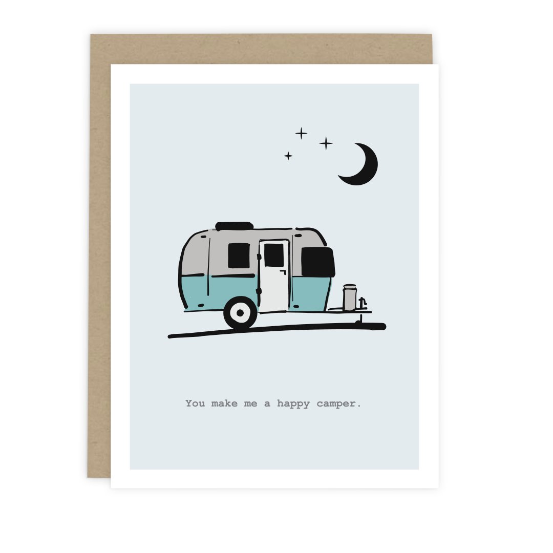 You light my fire. Tell a friend or loved one how much you care with this whimsical bonfire / campfire hand-illustrated card, whether it's your anniversary, their birthday, a hard situation, or just because. Size: A2 / 5.5”x 4.25” blank note card Material: Sturdy white recycled cover stock Process: Full-color Count: Single blank note card Features: Includes a clear protective sleeve Envelope: Recycled kraft Origin: Made in the USA Made in United States of America