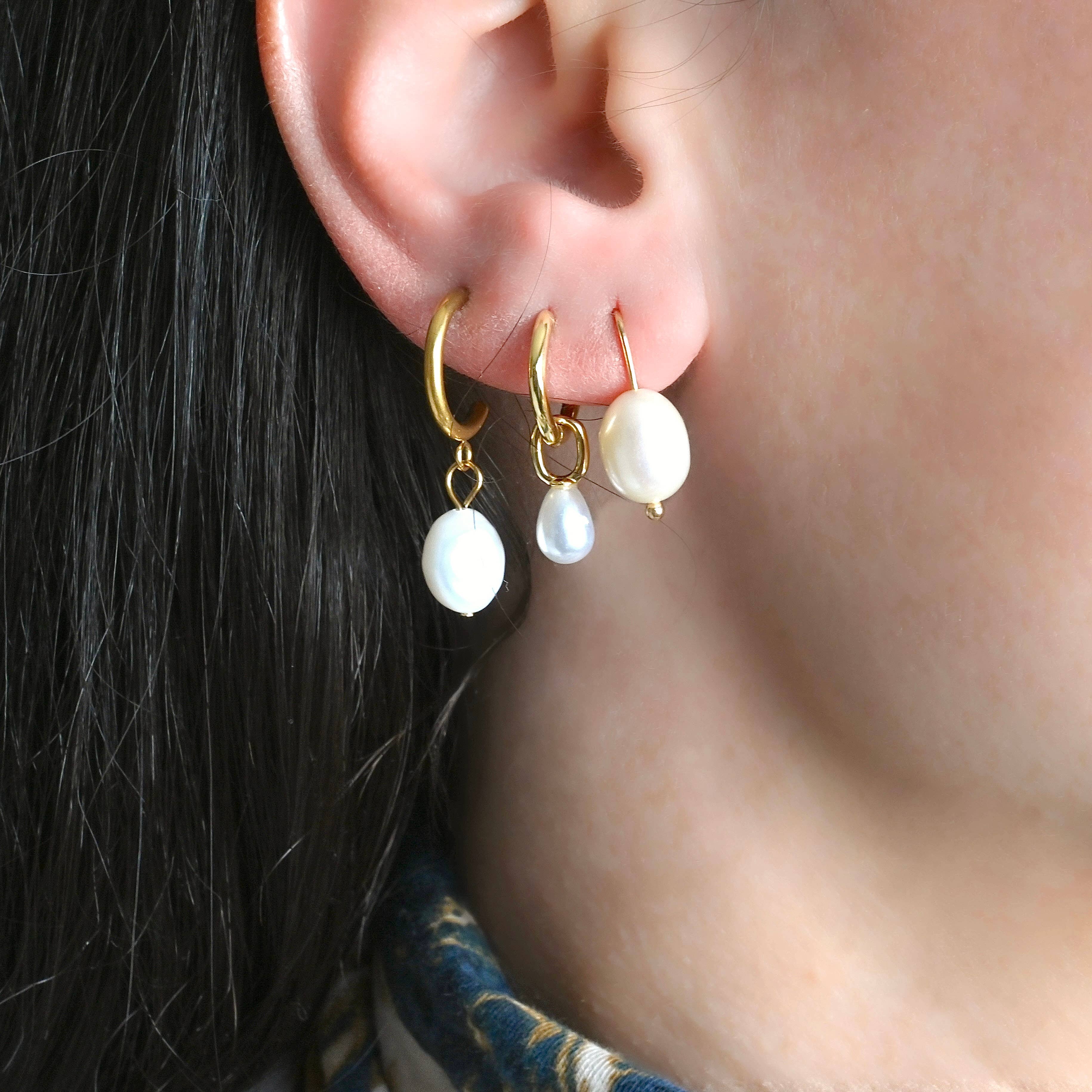 Size: 0.75" | 0.4" | 0.25" x 0.25" Available in Gold The Birthstone collection lets you individualize your everyday style with a set of earrings you can mix and match for any occasion. The June Earrings showcase delicate huggie hoops with a dangling pearl-toned stone that represents love, matching cushion stone studs, and a gold plated triple dot bar.