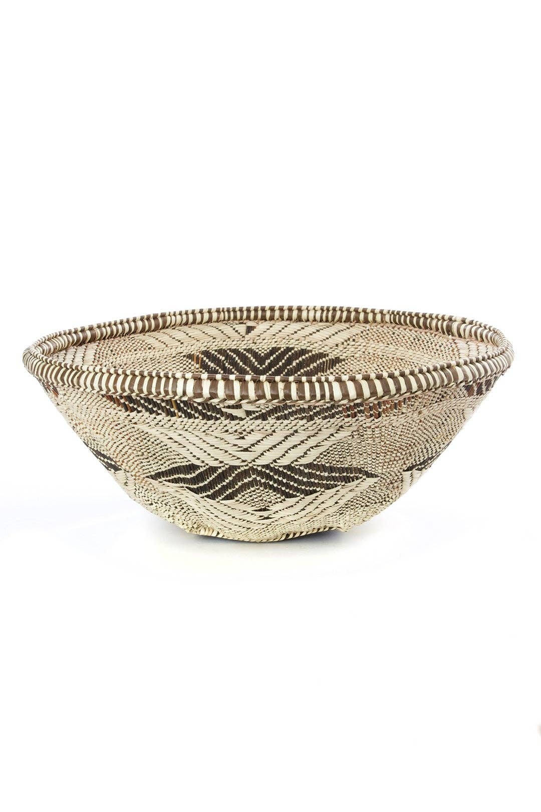 These baskets are a classic Tonga style made in the remote Binga district in Zimbabwe, home of the Balonga people and the Businiwa Community. They are the master weavers of these amazingly beautiful baskets. Following ancient traditions, women still use small vines, wild grasses and ilala palm leaves to weave these intricate patterns. Originally used for winnowing maize in rural areas, this collection of baskets will add a beautiful and functional handmade piece to your home. Available in three sizes: Small, Medium and Large. Small: 8”W x 4”H Medium: 10.5”W x 4”H Large: 12”W x 4.5”H
