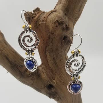 Tibetan earrings made with traditional handcrafted Tibetan brass bead inlaid with lapis lazuli and coral. Topped with a coral bead. Materials: Round brass earring with lapis lazuli and coral chips, topped with a coral bead. Length: 50 mm long Handmade in Nepal: may contain slight variations