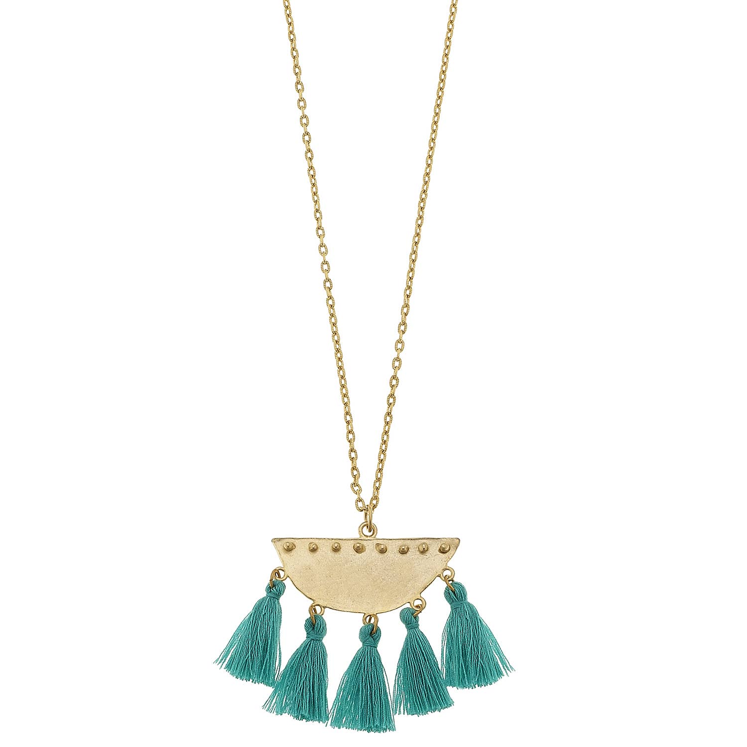 This is a beautiful necklace that features Turquiose colored Jasper & a brass Dream Catcher with delicate feathers on delicate vintage chain that has been plated gold. Dream catchers were created to capture the good dreams and filter out the bad ones. Jasper is said to help find inner peace and release stress. They appear bright turquoise in color. Metal: Brass Charm Chain Brass plated 18k Gold Handmade with Art and Soul