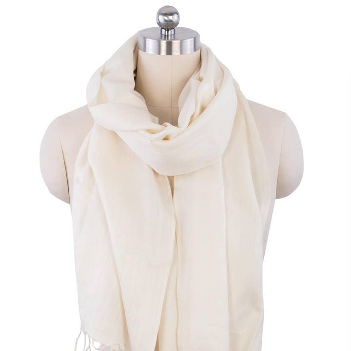 "Crafted from a soft cashmere silk blend, this cozy lightweight cashmere scarf is a can’t-leave-home-without-it necessity, offering the luxurious comfort and drape of a cashmere wrap. Designed to layer effortlessly, it delivers a refined cashmere feel scarf finish that works beautifully from day to evening styling. Material: 70% Cashmere, 30% Silk Size: 26"" x 78"" Made in India"