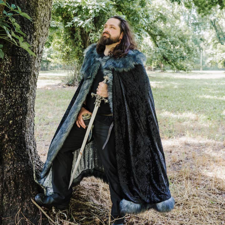 This medieval cloak is made from soft polyester crushed velour and comes with plush faux fur trim, leather straps, and hood. It's the perfect costume accessory for any Viking cosplay event or medieval barbarian LARP game. Sizing: These adult cloaks come in two sizes: Adult Small (46" long), Adult Large (56" long). Care: These cloaks are made from 100% polyester velour fabric. Dry Clean Only.