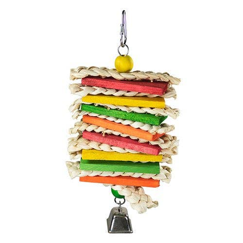 Our 10" Trio Popsicle Sticks was designed for small to medium parrots to enjoy. Canadian pine wood sliced thin with wooden beads are dyed with food dye, then strung on stainless steel wire with a cotton twist at the bottom. You'll love the 12 triple stacks with bead spacers. Because they spin around it'll challenge your bird with chewing fun. You can hang it anywhere in the cage with the provided quick link.