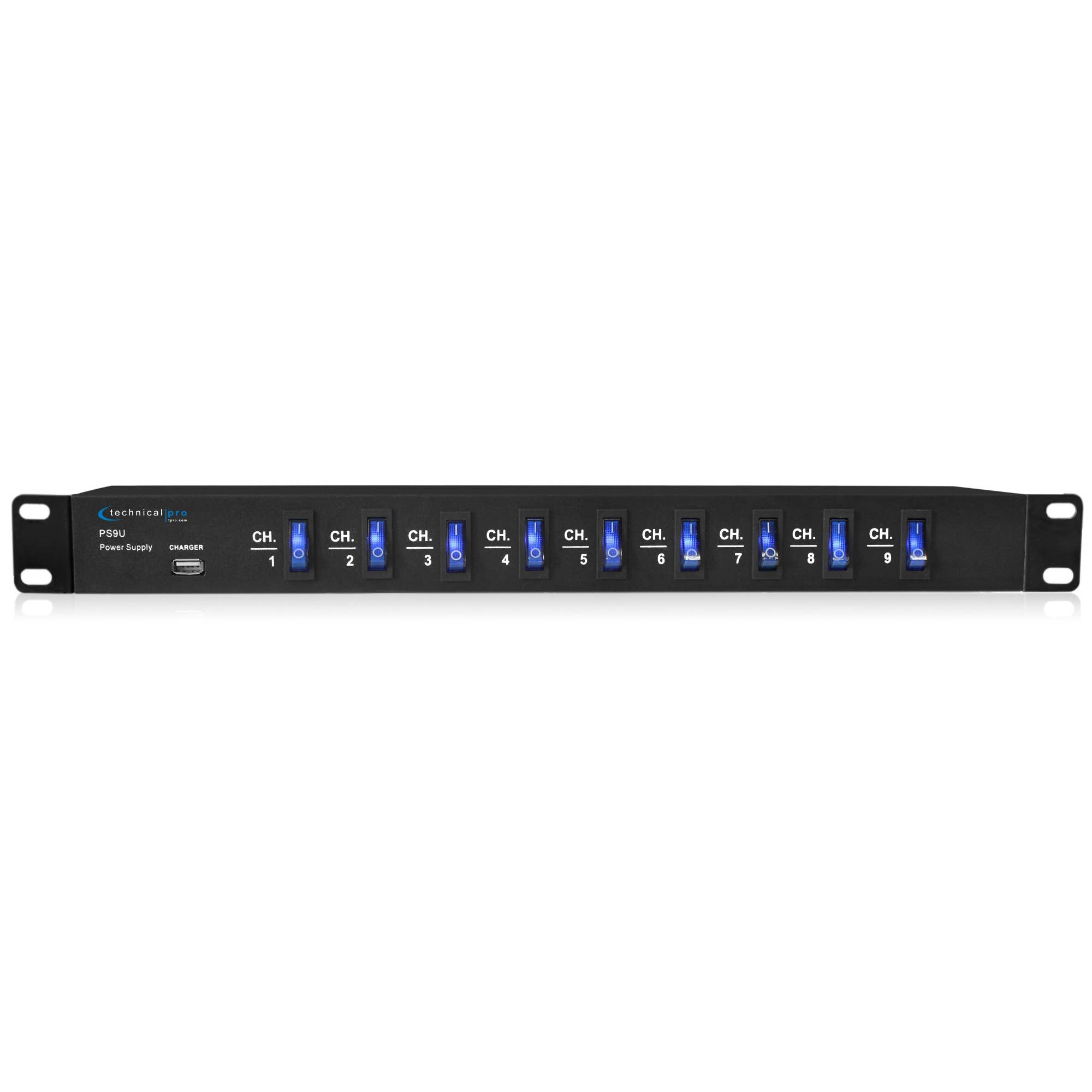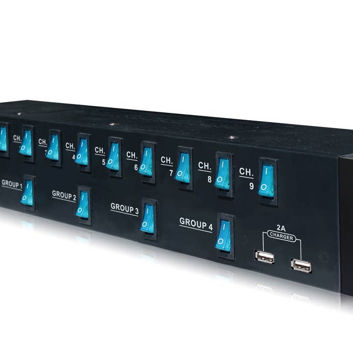 - 16 Rear Panel Wired Flexible Arm Power Cables are the star of the show allowing you to have the flexibility and comfort of knowing everything will fit comfortably - A/C power center designed to eliminate extension cords and messy wires - 5 power switches on the front panel with blue illumination - Each Switch controls a Group of 4 Outlets - Dependable 15A replaceable fuse housing on the rear panel - 16 rear panel 120V 3-prong plug sockets on the rear of the unit - 4 Front Panel Integrated AC Outlets - Includes Detachable Rack Mount Brackets - Plastic Cover Encased Power ON/OFF Switch - 4 USB Ports for Device Charging (Works with Smartphones, Tablets, MP3 Players, etc.) -
