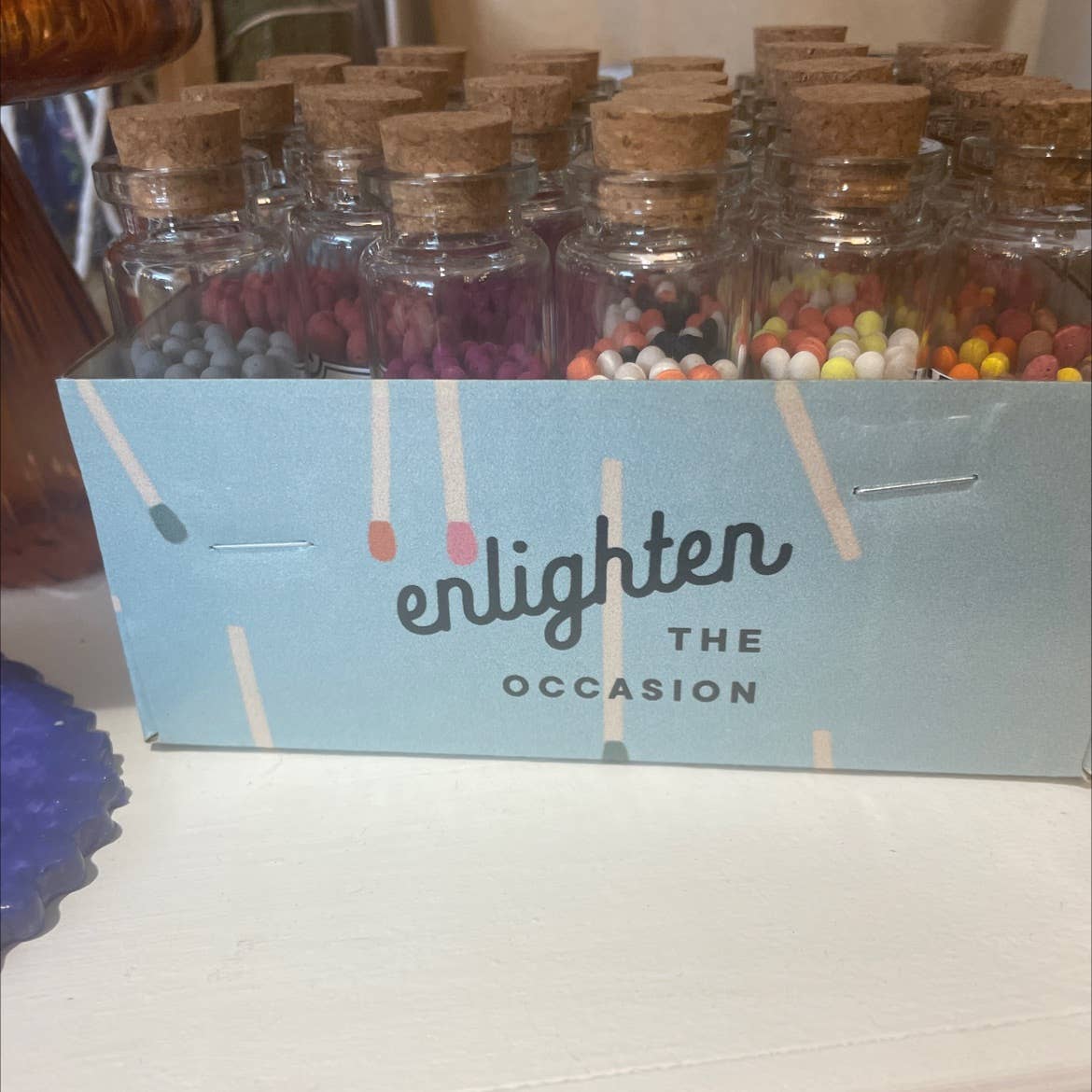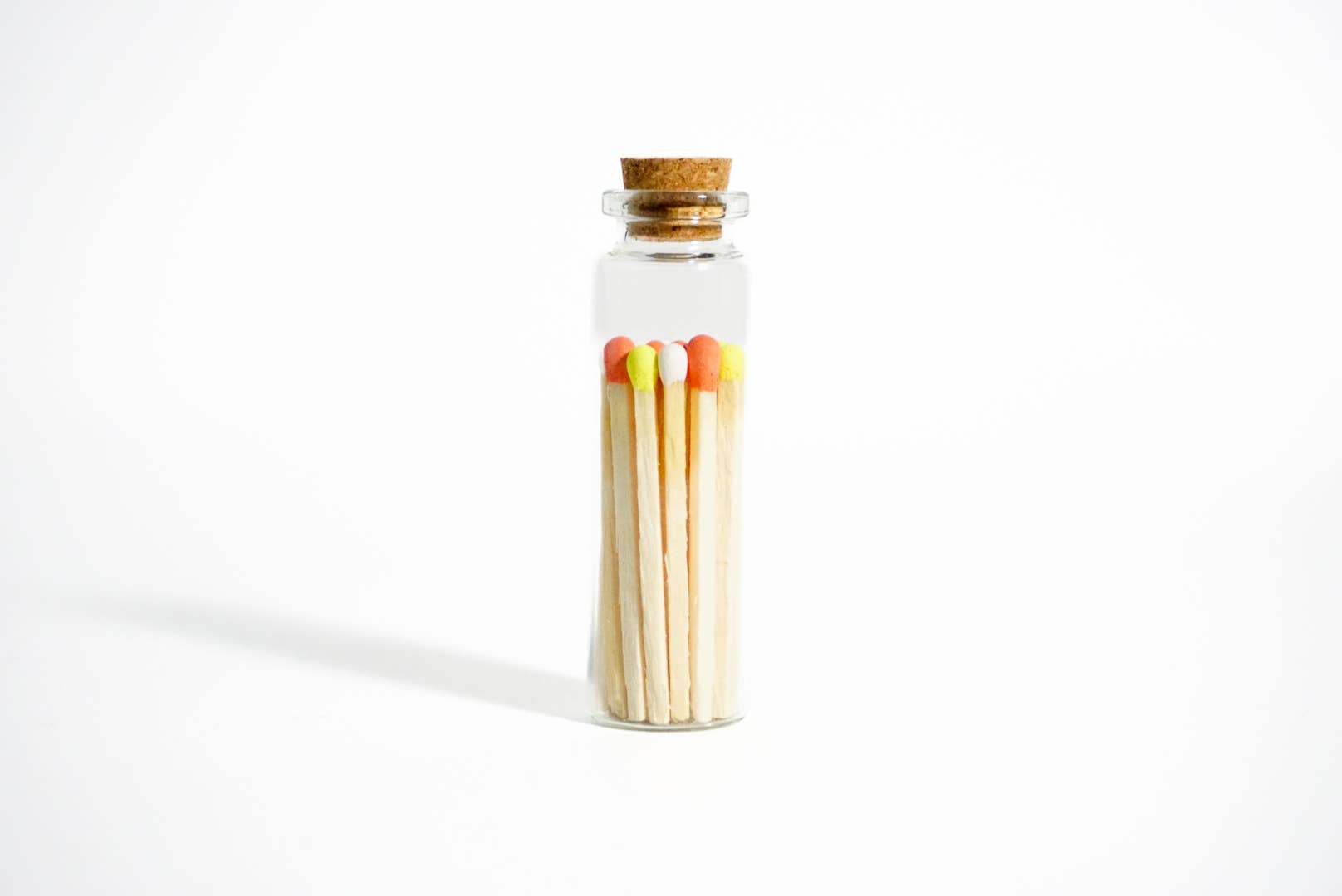 Light up your space with color tip matchsticks! Our colorful matches will add a spark of joy to any moment- with many vibrant color options. The corked vials are hand-filled in our studio and come with a handy match striker so you can light up your favorite occasion anytime. ■ Corked glass vial ■ Adhesive phosphorous match striker on bottom of glass ■ 2 inch wooden matches are for single use ■ Great to add in with any candle to create a gift package or as a wedding favor Enlighten the Occasion! Vials are 2.55 H.