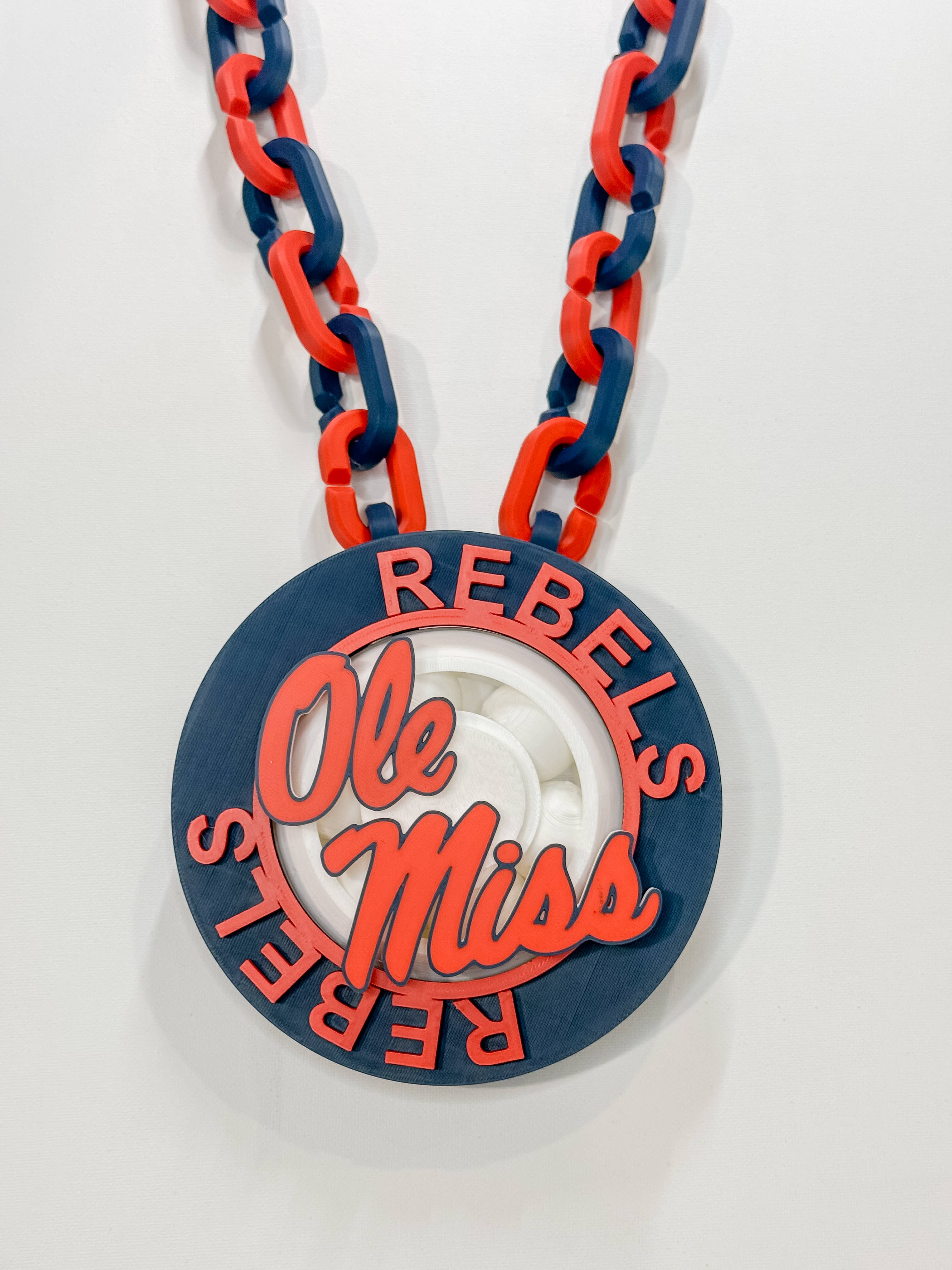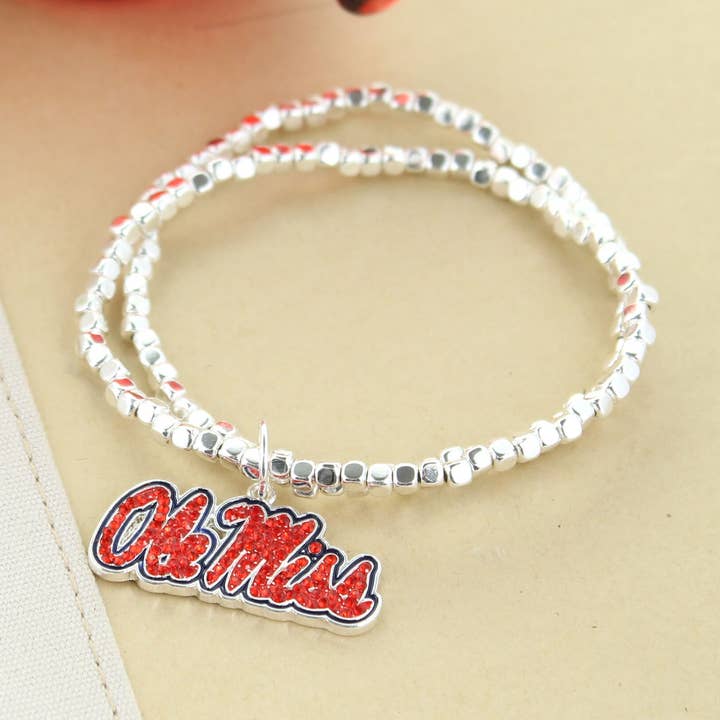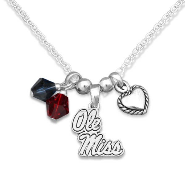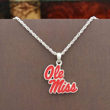 16” in length, this silver plated Ole Miss logo necklace features red rhinestones and blue enamel with a claw clasp and 3” extender. This is an officially licensed product.