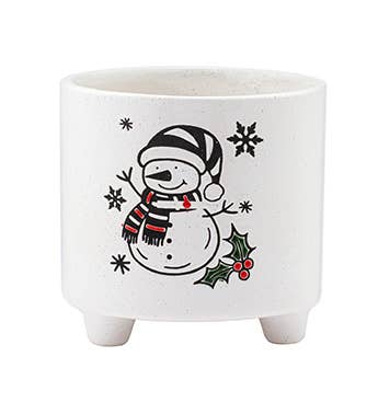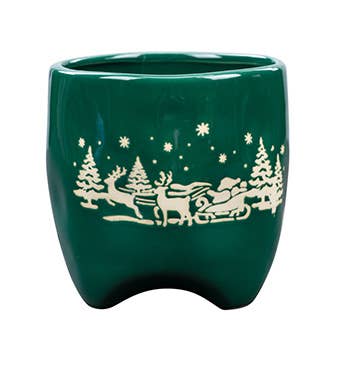 360° Winter Wonderland Village Planter - Complete Christmas Scene Step into a storybook Christmas with this breathtaking planter that brings an entire snowy home to life. The enchanting design wraps completely around the planter, creating a continuous winter wonderland that tells a heartwarming holiday story from every angle. From the warm glow emanating from the cabin windows to the careful arrangement of colorful gift boxes waiting to be discovered. The snow-laden trees create natural boundaries while the welcoming streetlight guides visitors through this magical winter scene. Made of Ceramic 4.75" H x 4.75 Op
