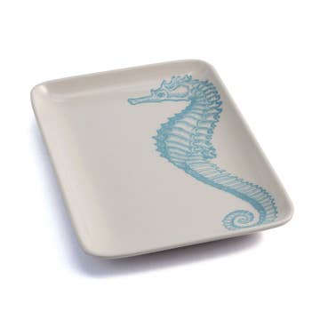 Escape to the ocean. Our sea life collection of melamine tableware was inspired by all of the creatures of the deep. Seahorse Soap Dish melamine dishwasher safe BPA free do not microwave measures 6.5" X 4.5" our small tray is the perfect size to use as a soap dish or as a trinket tray to hold your treasure chest of jewels