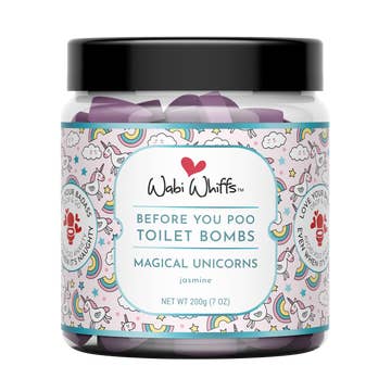 Magical Unicorns (Jasmine) Fragrance Description: Suspend reality where whimsy meets fantasy with intoxicating Jasmine fragrance reminiscent of forests filled with fairies and unicorns. Contains purple and pink fizzing hearts with purple and pink biodegradable glitter. GREAT FOR POTTY TRAINING! Keep them handy and eliminate poo odor instantly. Drop 1-2 fizzing bombs (no judging) into the toilet. An effervescing fragrant film forms on the toilet water trapping and eliminating odors. Just Drop, Go and Flush when done. Let the FUN begin! Approximately 60 poos Contains cosmetic non-staining color, natural essential oils, biodegradable glitter, citric acid, and baking soda Discreet, convenient and works instantly Dissolves quickly with no need to wait for bombs to totally dissolve just DROP & GO and Have a Poo Happy Day! Septic safe (that’s code for YES, it’s safe to flush!) Non-Toxic bathroom odor solution Great for offices, roomies & all shared spaces